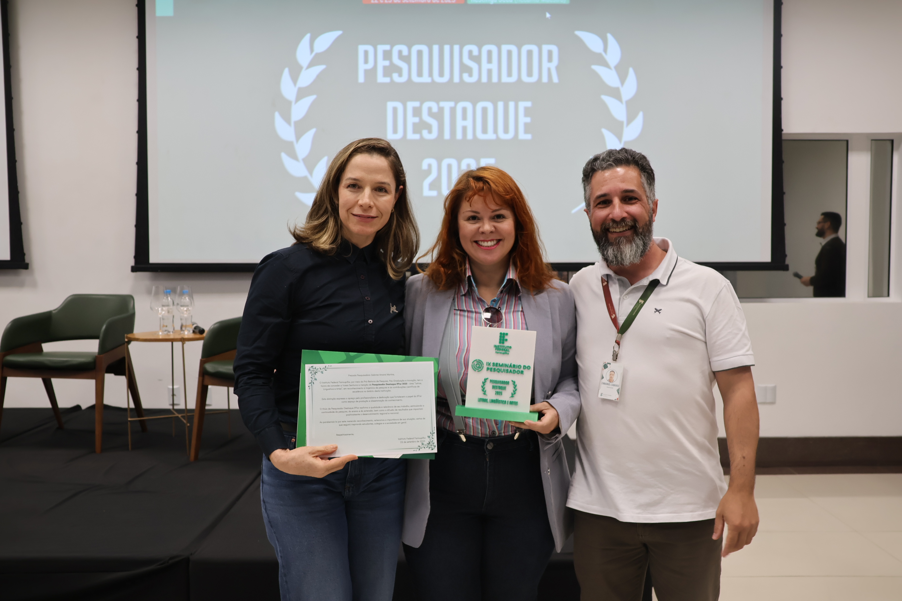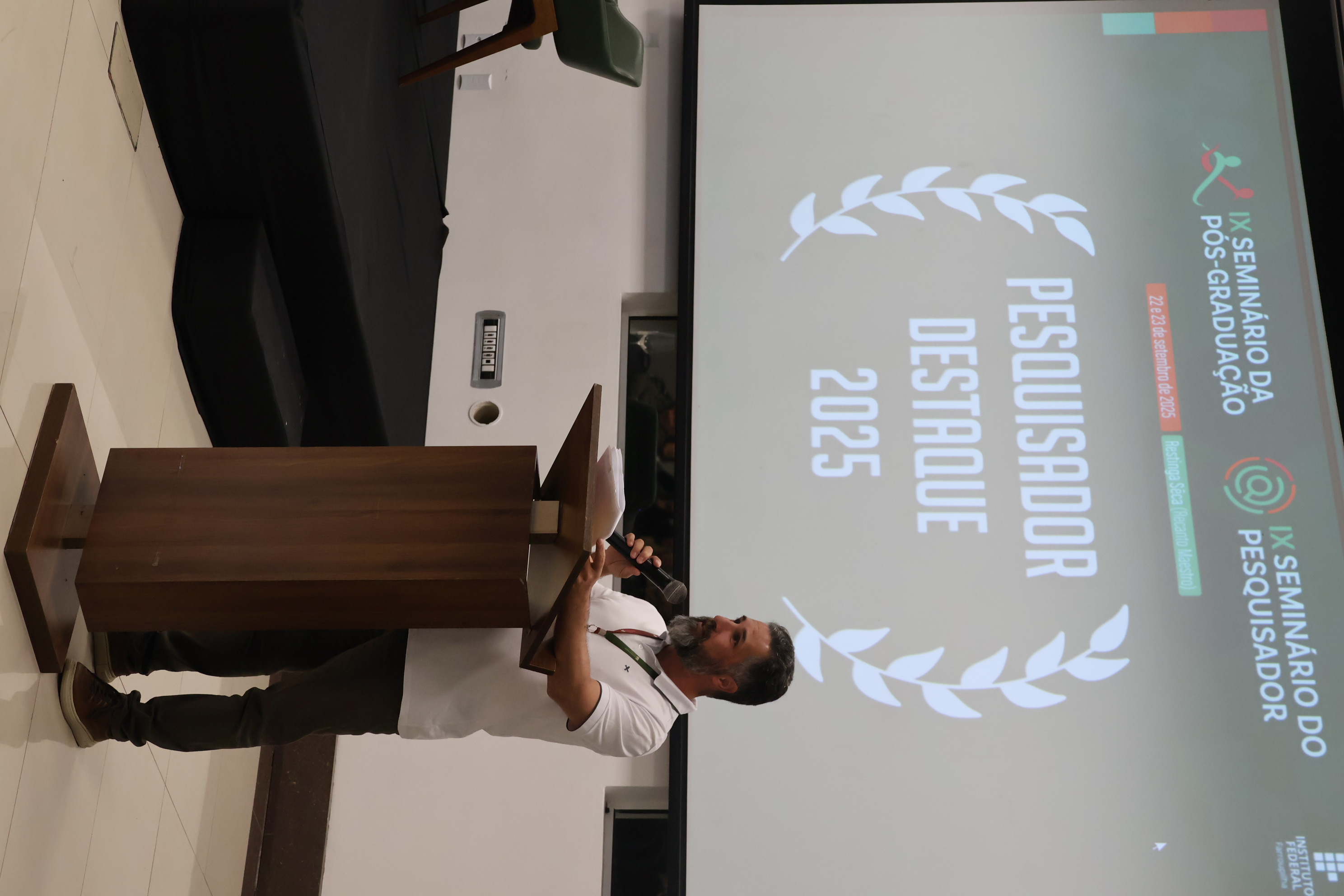 O IFFar celebrou, na tarde do dia 23 de setembro, a primeira edição do Prêmio Pesquisador Destaque, durante a programação conjunta do IX Seminário do Pesquisador e do IX Seminário da Pós-Graduação, no Recanto Maestro, em Restinga Sêca. A premiação, criada neste ano pela Pró-Reitoria de Pesquisa, Pós-Graduação e Inovação (PRPPGI) em parceria com a Coordenação de Pesquisa, nasceu para dar visibilidade ao trabalho de docentes e técnicos que fortalecem a produção científica da instituição.