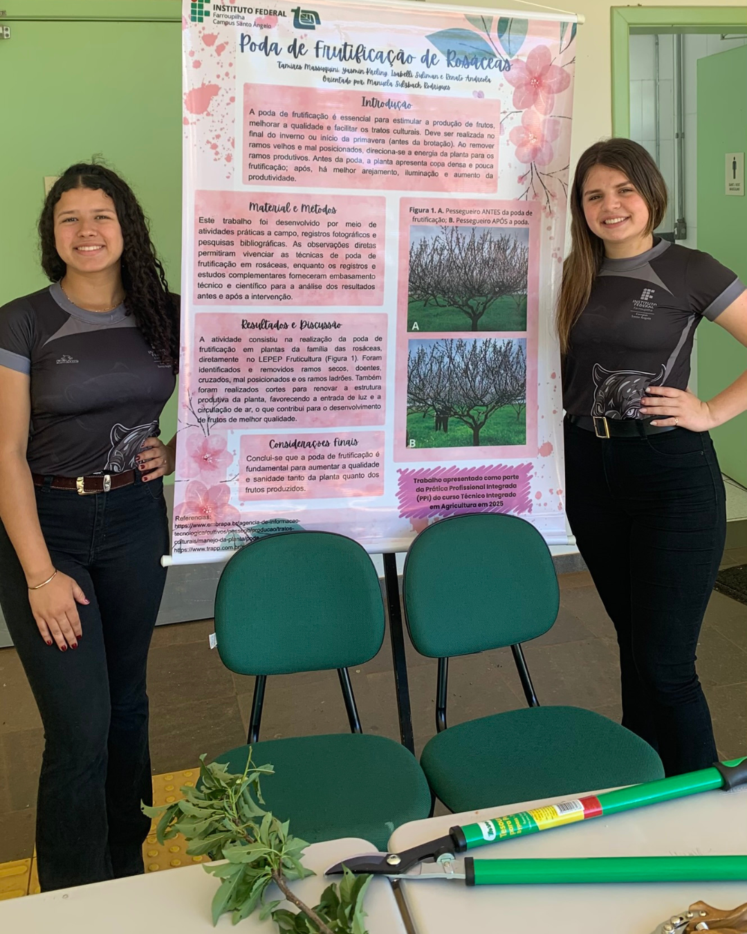 A turma do 2º Ano do Curso Técnico em Agricultura (AGR21) apresentou, no dia 24/11/2025, os trabalhos da Prática Profissional Integrada - PPI, onde os estudantes simularam um dia de campo com apresentações na área de Fruticultura (Orientados pela professora Manuela Sulzbach Rodrigues) e Mecanização Agrícola (orientados pelo professor Airam Fernandes).