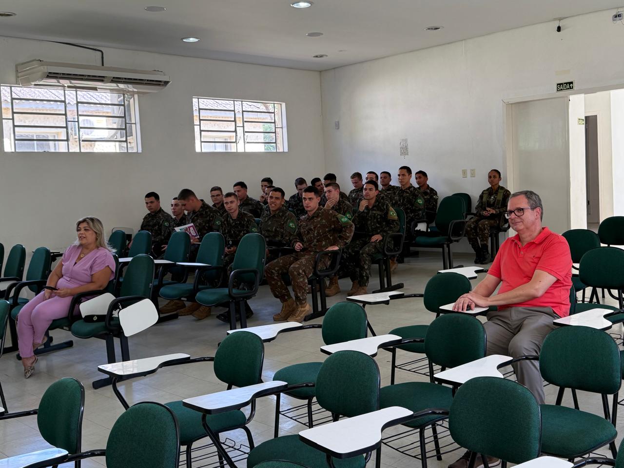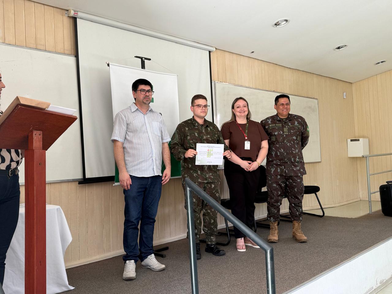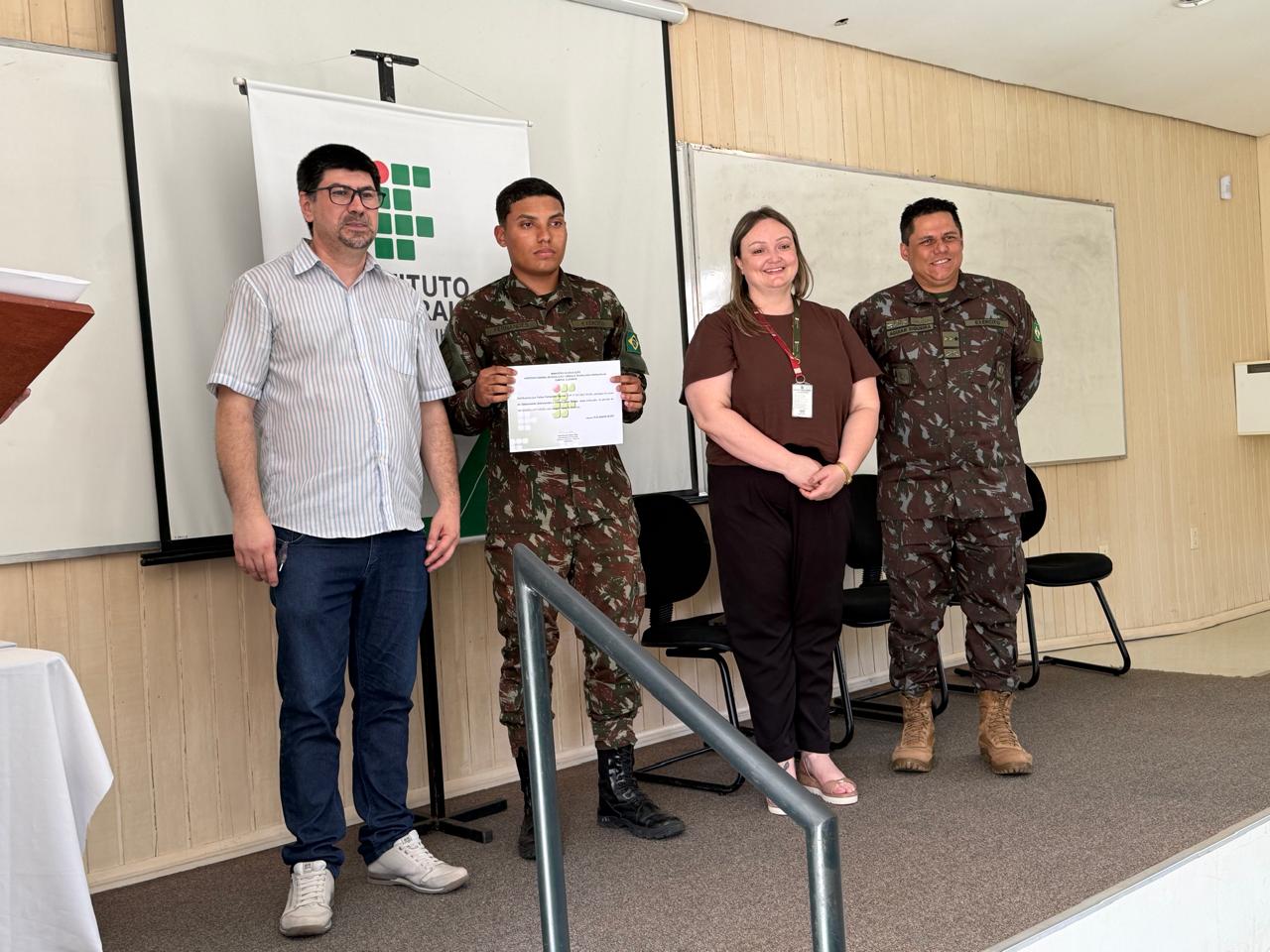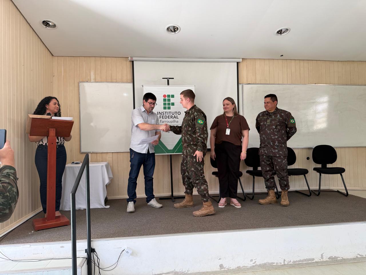 A cerimônia ocorreu no auditório da Depep do IFFAR e contou com a presença do Exmo. Sr. Tenente Coronel Siqueira, Comandante do 10 B LOG acompanhado de sua esposa Elisa Lima, da Diretora Geral do IFFAR Profa Mirian Marchezan, da Coordenadora da Extensão Darla Maia, do Coordenador do projeto prof. Marcelo Roza e do ministrante do curso prof. Heleno Cabral.