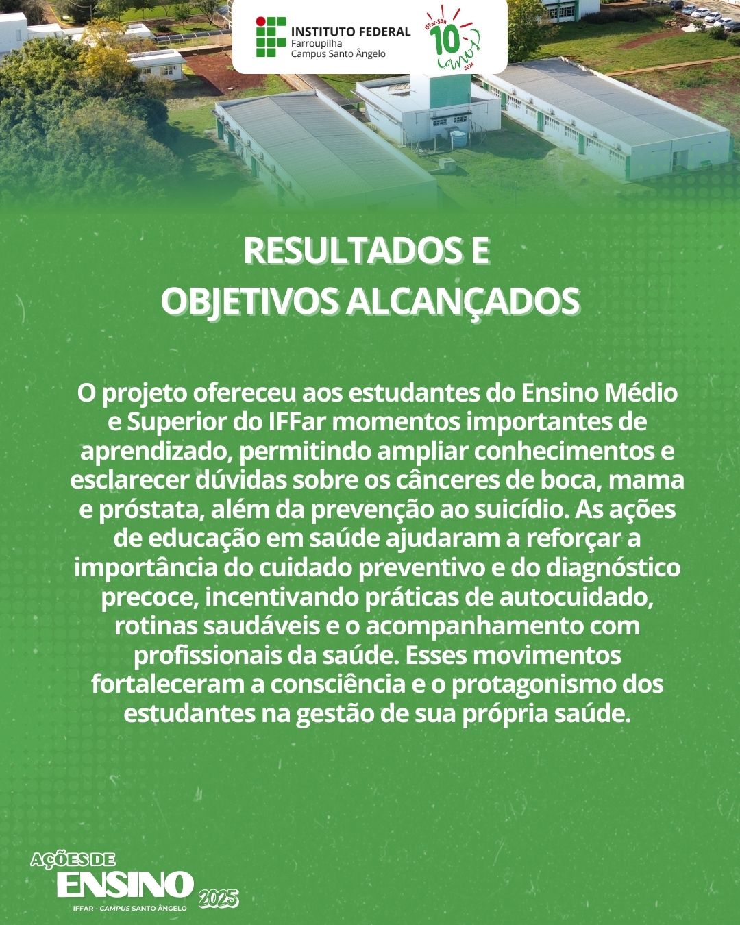 Por meio de rodas de conversa e atividades educativas, o projeto abordou temas relevantes para a formação integral dos estudantes, como a prevenção ao câncer de boca, mama e próstata, além da conscientização sobre saúde mental e prevenção ao suicídio. As atividades proporcionaram momentos de diálogo, troca de experiências e reflexão, fortalecendo o acesso à informação e o cuidado com a saúde de forma integral.