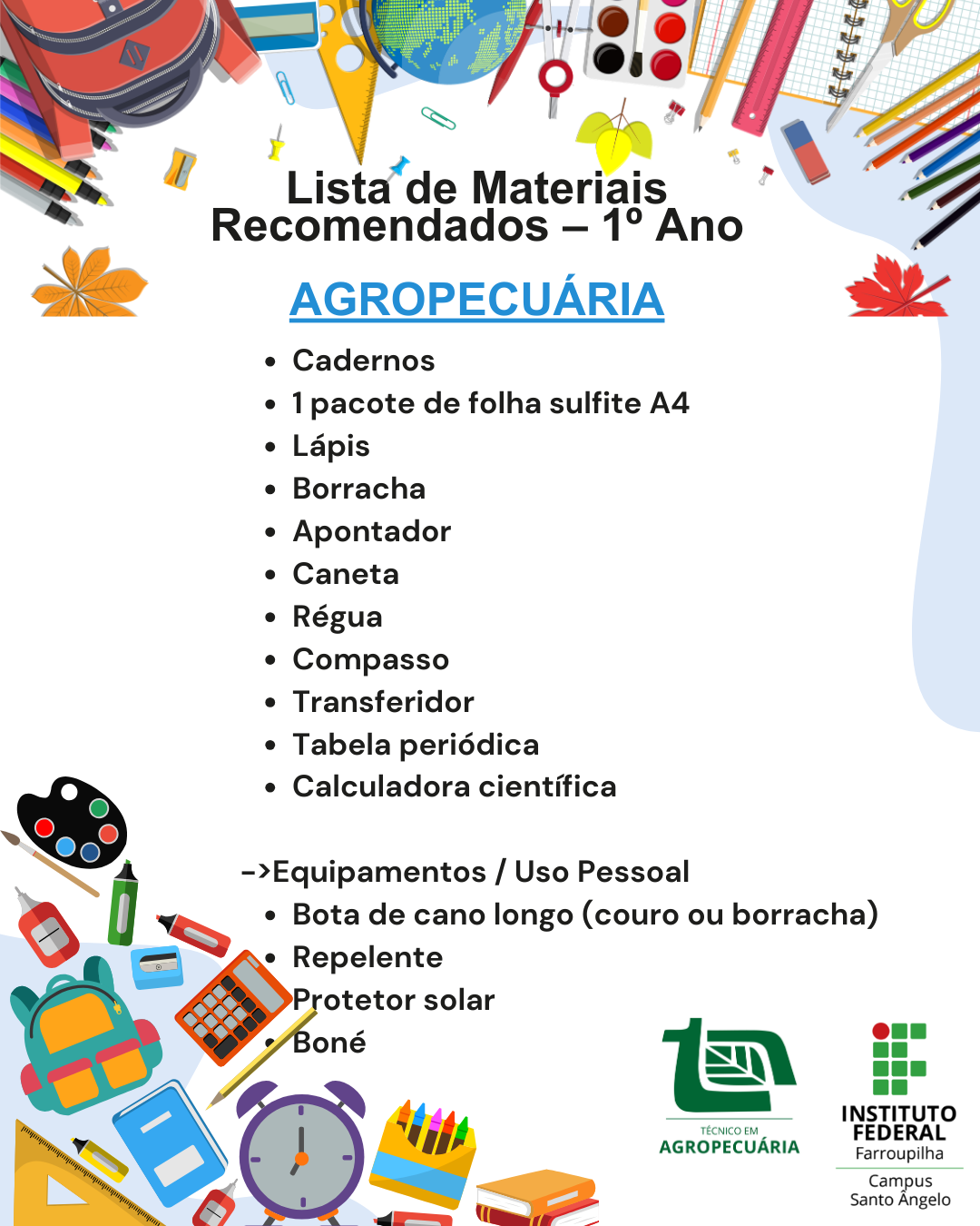 No caso dos cursos com atividades em ambientes externos e de campo, como Agropecuária e Agricultura, também são indicados equipamentos de uso pessoal, fundamentais para a segurança e o conforto dos estudantes durante as práticas pedagógicas.