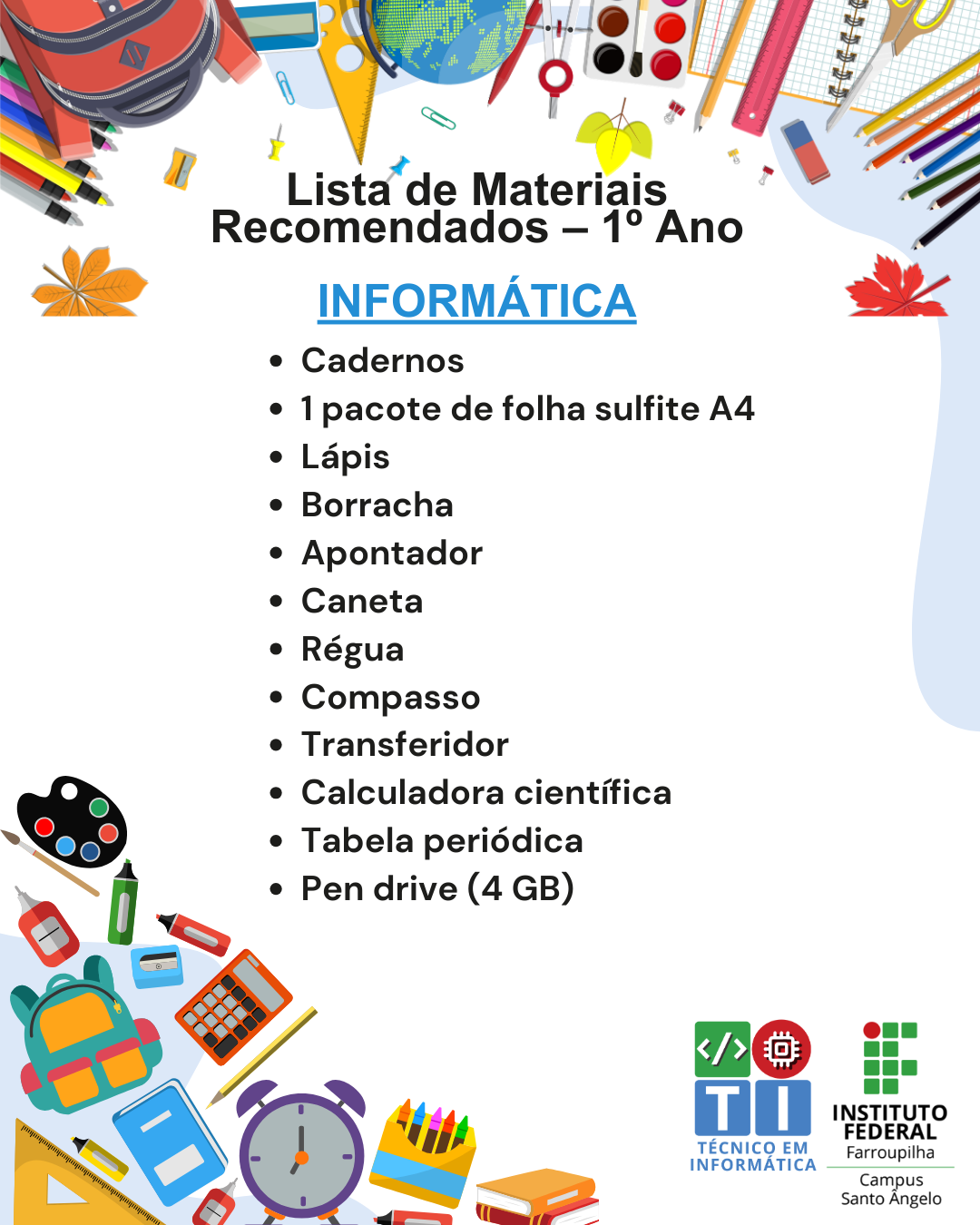 A lista de materiais recomendados para os estudantes ingressantes dos cursos técnicos integrados.