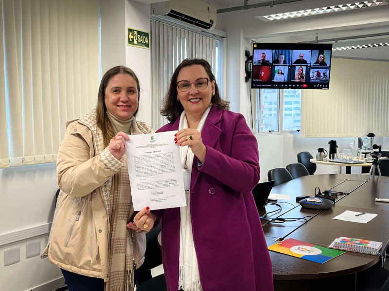 Professora Alexsandra Paz Trindade, docente de Educação Especial do Campus São Borja, com o termo de posse ao lado da reitora do IFFar, professora Nídia Heringer.
