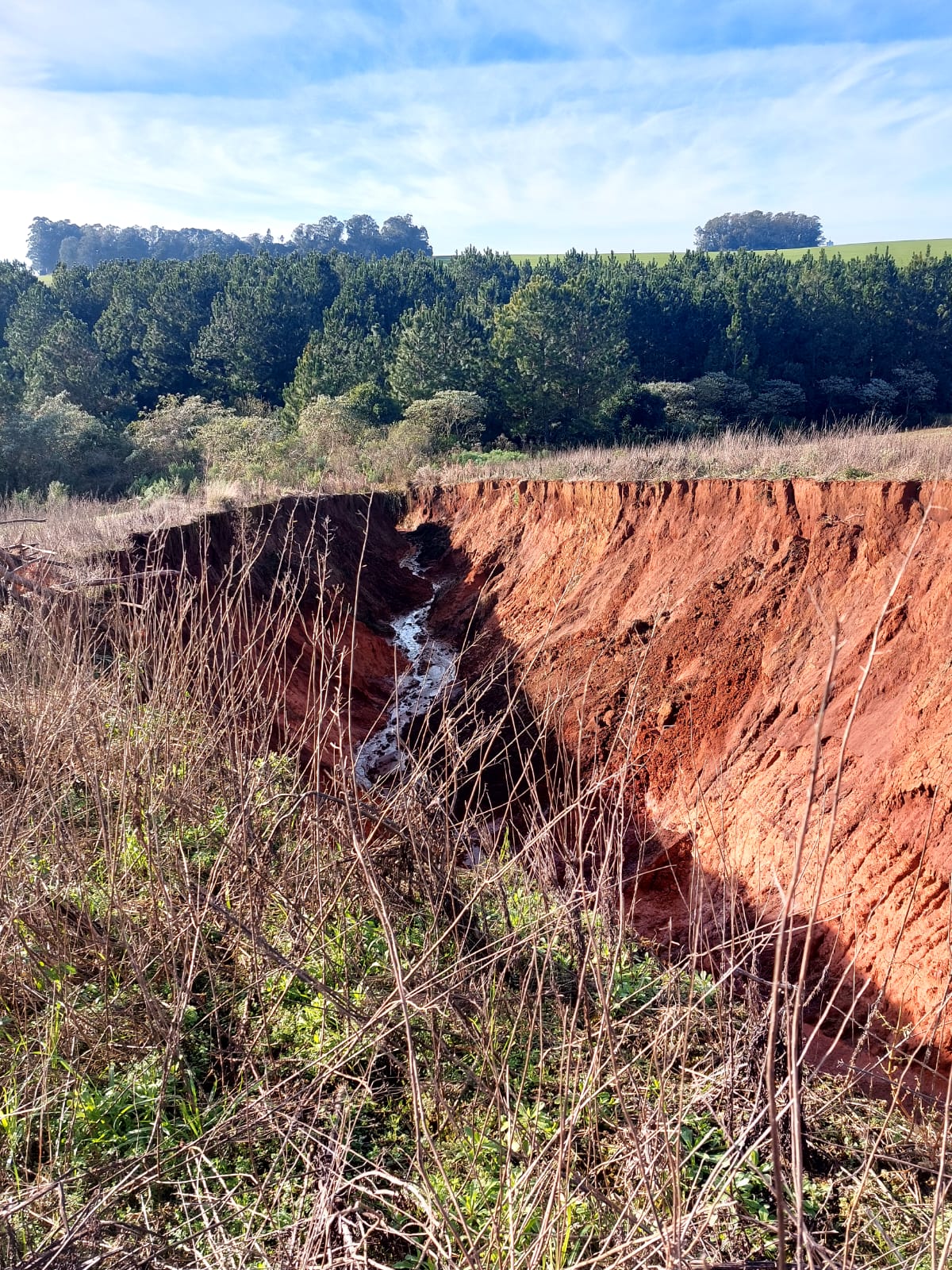 As visitas de campo incluíram as nascentes dos rios Fiúza e Caxambu, ambas localizadas no interior do município de Santa Bárbara do Sul. As duas áreas estão inseridas em estratos geológicos compostos por solos resultantes da decomposição da Formação Serra Geral, intercalados com arenitos, o que confere alta suscetibilidade a processos erosivos laminares e lineares. Nesses locais, foram identificados processos de voçorocamento em estado avançado.