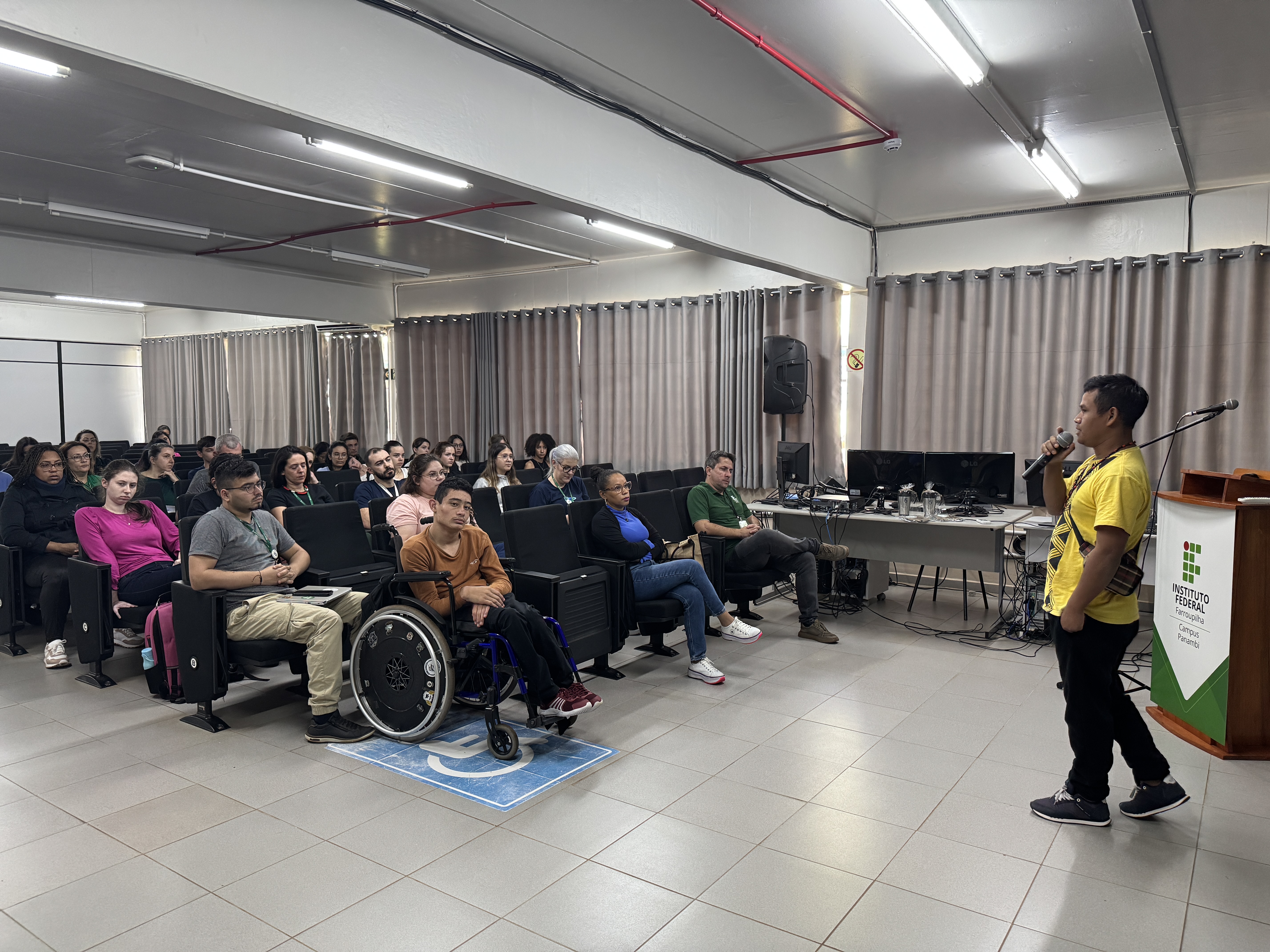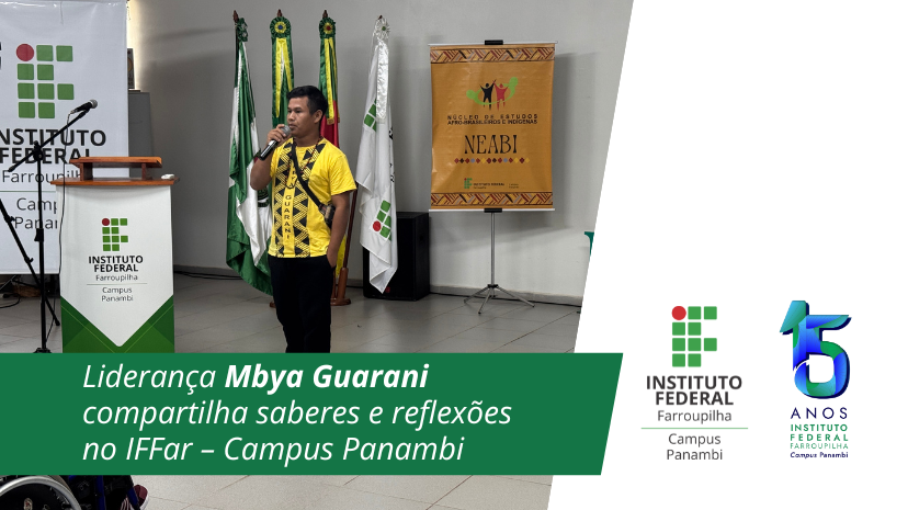 Na tarde de ontem, quarta-feira, 23 de abril, o Núcleo de Estudos Afro-brasileiros e Indígenas (NEABI) do IFFar – Campus Panambi promoveu a palestra “Cultura Mbya Guarani: legados do passado, desafios do presente”, conduzida pela liderança indígena Kuaray Anildo Romeu, da aldeia Tekoa Pyau. O evento, realizado no auditório do campus, reuniu estudantes, servidores e convidados externos em um momento de escuta e reflexão sobre a cultura e os saberes dos povos originários.