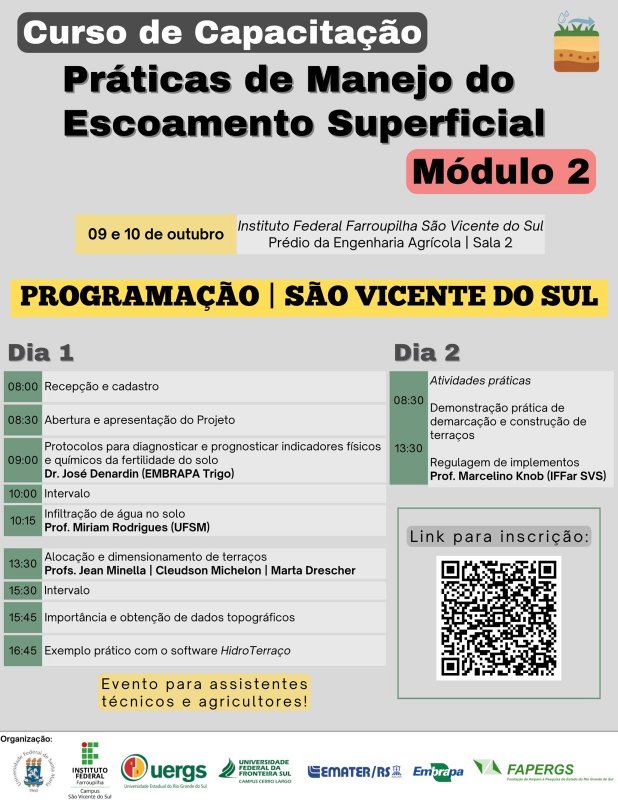 Nos dias 9 e 10 de outubro, o Campus São Vicente do Sul sedia uma edição do módulo 2 do Curso de Capacitação “Práticas de manejo e escoamento superficial”, que é promovido pelo projeto “Estratégias de conservação de solo e de água em bacias rurais para a adaptação dos sistemas produtivos às mudanças climáticas”, iniciativa de caráter multi-institucional que reúne diversos subprojetos interligados.