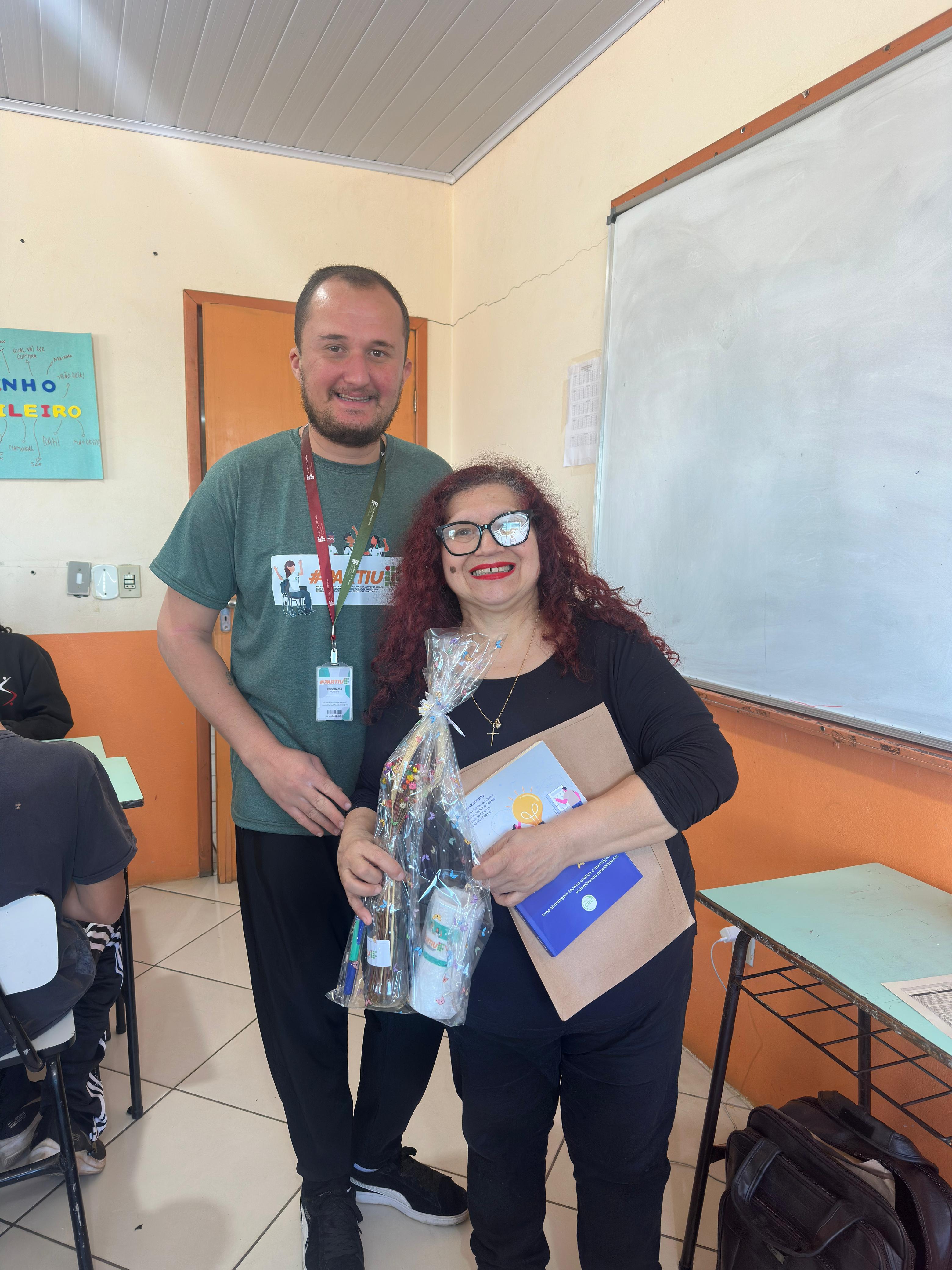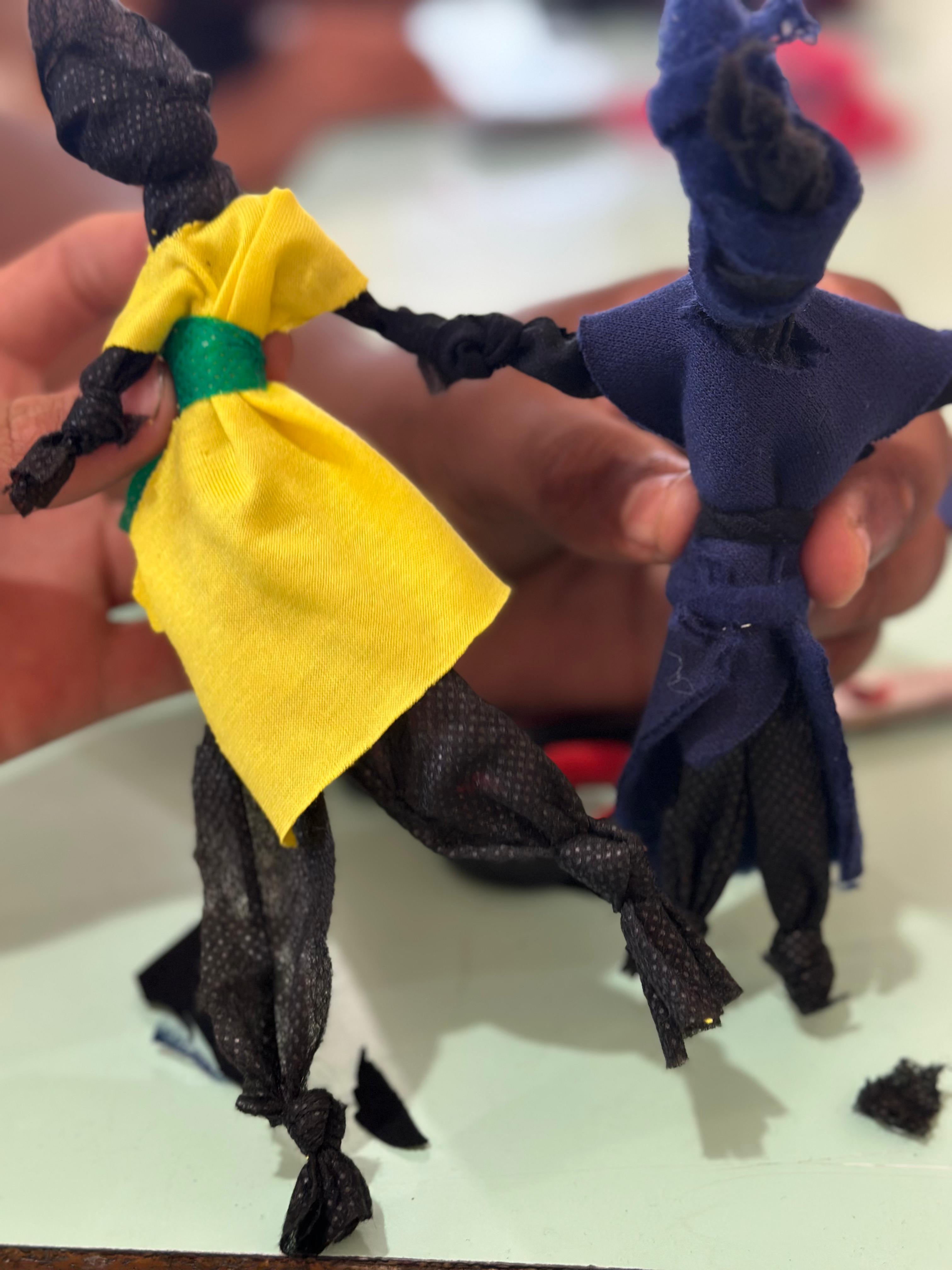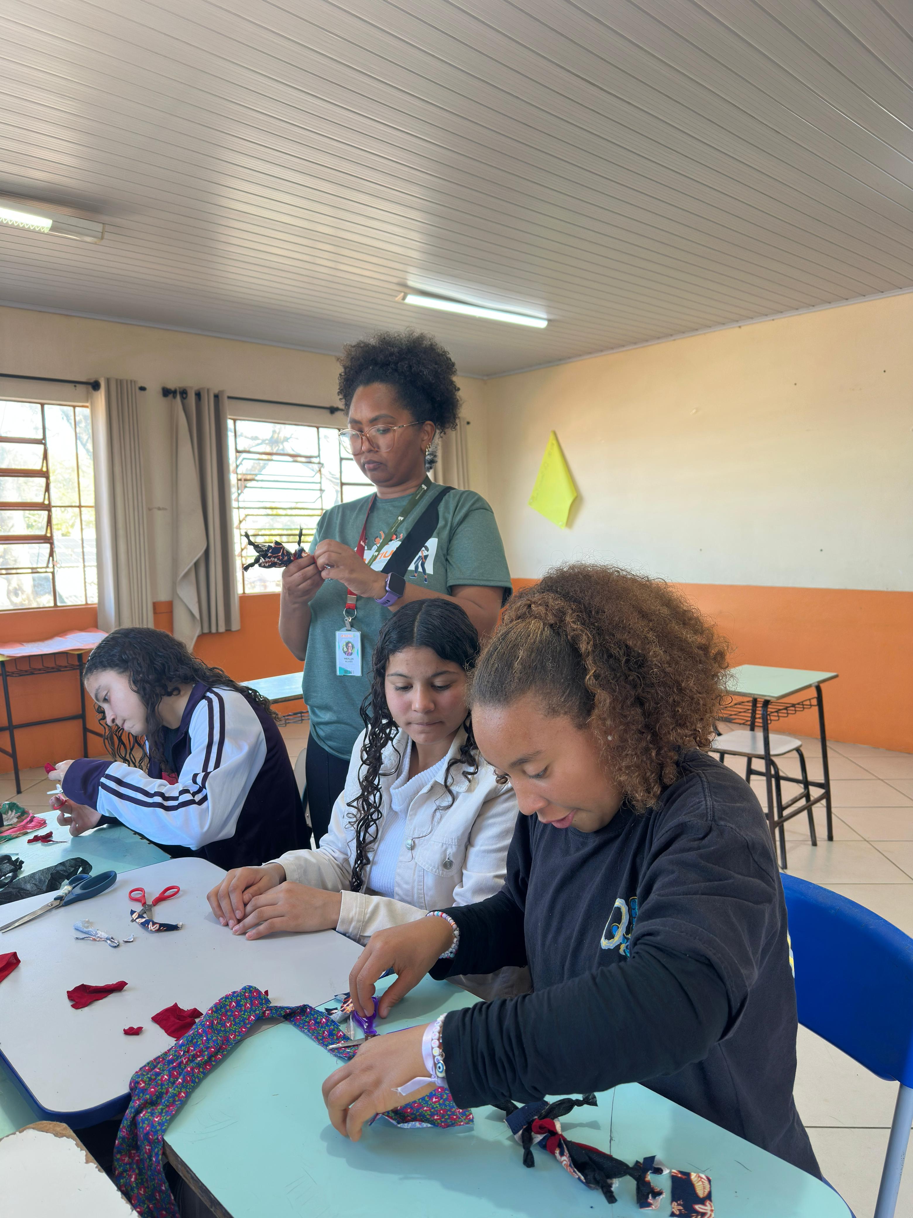 Encerrando as atividades do mês, no dia 28, o programa recebeu a professora Ana Lúcia Vargas, Mestra em Políticas Públicas e Gestão Educacional pela UFSM, que contou a história da criação da boneca Abayomi, desenvolvida pela artesã Lena Martins na década de 1980. A narrativa trouxe reflexões sobre identidade negra, valorização cultural e consciência social. Na sequência, foi realizada uma Oficina de Confecção de Abayomi, conduzida pela professora de Língua Portuguesa, Merlen Alves, permitindo que os estudantes colocassem em prática os conceitos abordados na contação de histórias.