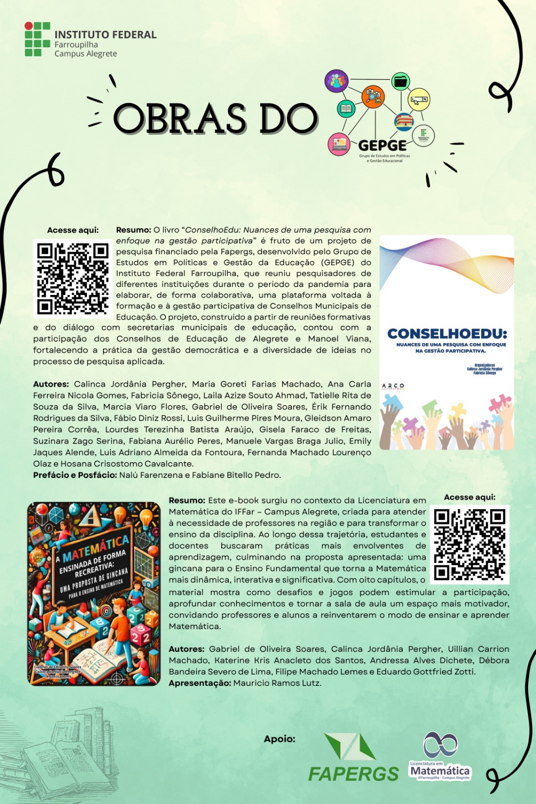 Na sexta-feira à noite, ocorreu o lançamento de duas obras produzidas por servidores e estudantes do campus. O Grupo de Estudos em Políticas e Gestão da Educação (GEPGE) apresentou o livro “ConselhoEdu: Nuances de uma pesquisa com enfoque na gestão participativa”, resultado de um projeto financiado pela Fapergs, que reuniu pesquisadores de diferentes instituições para refletir sobre a gestão democrática da educação e a participação dos Conselhos Municipais de Educação.