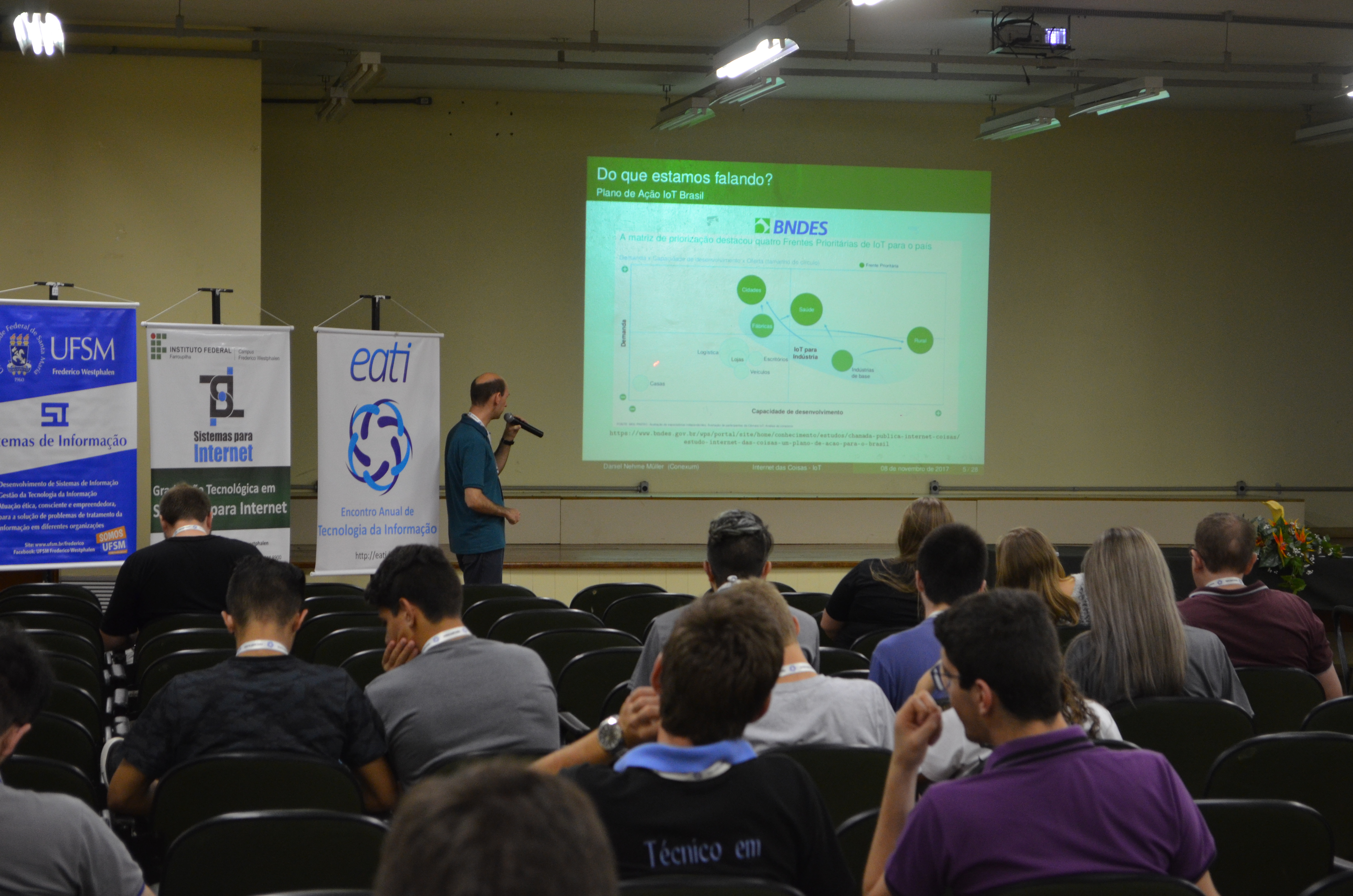 Já na quarta-feira, 08, o tema abordado foi “Internet of Things - IoT (Internet das Coisas)” que foi ministrada por Daniel Nehme Muller. A palestra abordou uma tendência muito concreta e emergente: os dispositivos computadorizados que usamos diariamente e que utilizam o acesso à Internet. O palestrante apresentou políticas públicas que estabelecem prioridades em áreas de pesquisa e áreas de negócio com grande potencial. Foram apresentadas inúmeras aplicações destes dispositivos, principalmente em cidades inteligentes, em atividades do agronegócio e também na área da saúde.