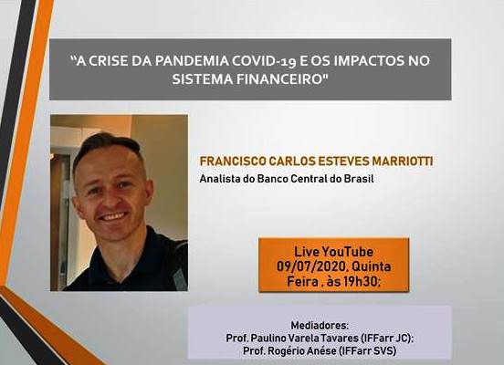 Na próxima quinta-feira às 19:30, através da plataforma do You Tube acontece a Live “A crise da Pandemia Covid-19 e os impactos no sistema financeiro”, com o analista do Banco Central do Brasil, Francisco Carlos Esteves Marriotti. O tema terá como debatedores os professores do IFFar Paulino Varela Tavares (Campus Júlio de Castilhos e Rogerio Anése ( Campus São Vicente do Sul).
