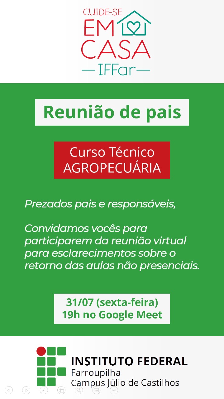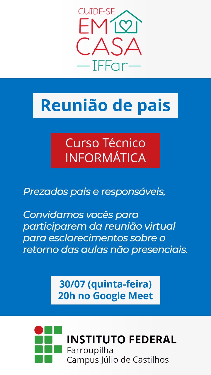 Os pais e responsáveis dos estudantes dos cursos técnicos integrados em Agropecuária e Informática também terão um momento para conhecer as metodologias de ensino e a organização das disciplinas durante esse período de aulas remotas. As reuniões serão pela plataforma Google Meet na quinta-feira (30) às 20h para o curso técnico de Informática e, na sexta-feira (31) às 19h para o curso técnico de Agropecuária.