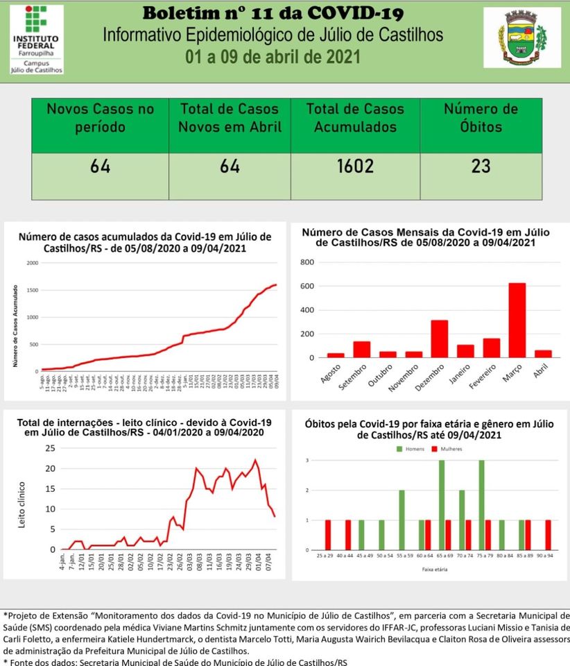 O Instituto Federal Farroupilha Campus Júlio de Castilhos (IFFar-JC), por meio do Projeto de Extensão “Monitoramento dos dados da Covid-19 no município de Júlio de Castilhos", em parceria com a Secretaria Municipal de Saúde (SMS) apresenta os dados sobre a infecção pelo novo coronavírus no município no 11º Relatório Epidemiológico. Este conta com o "Vacinômetro", que destaca o acompanhamento da vacinação contra a Covid-19 em Júlio de Castilhos.