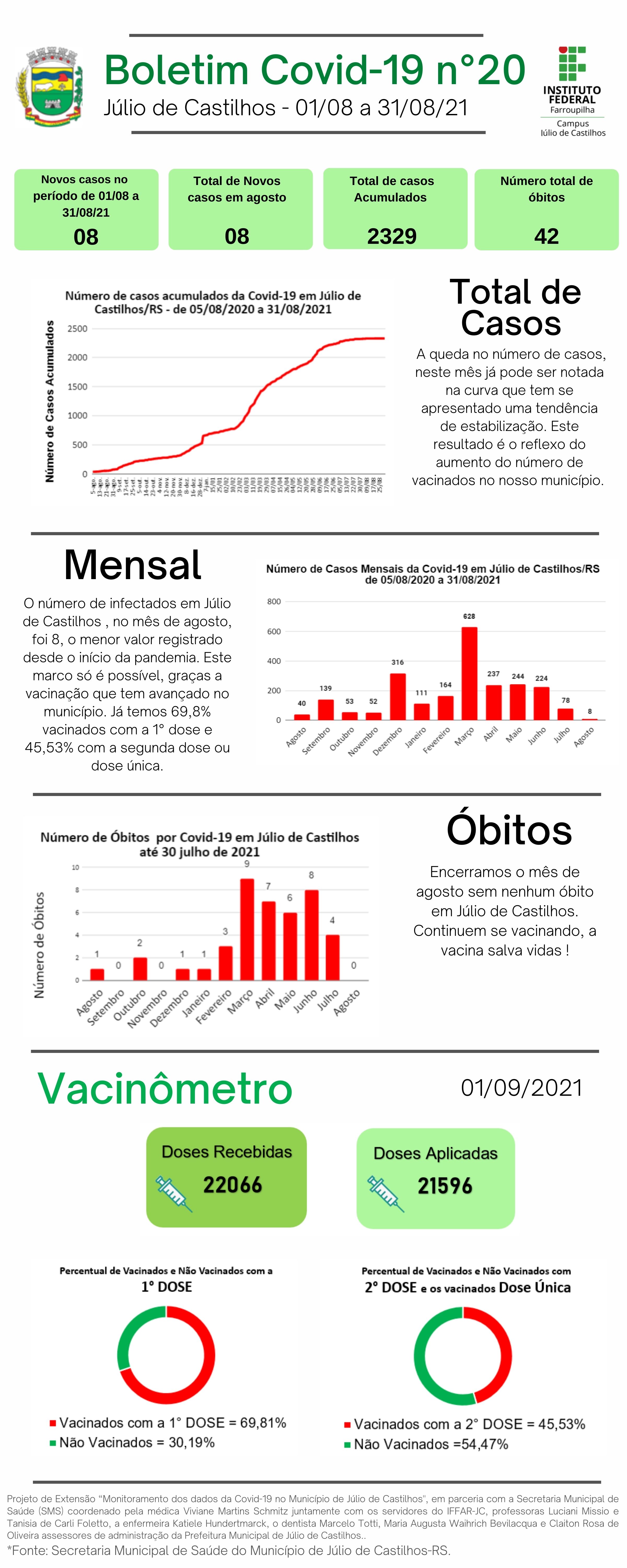 O Instituto Federal Farroupilha Campus Júlio de Castilhos (IFFar-JC), por meio do Projeto de Extensão “Monitoramento dos dados da Covid-19 no município de Júlio de Castilhos", em parceria com a Secretaria Municipal de Saúde (SMS) apresenta os dados sobre a infecção pelo novo coronavírus no município no 20º Relatório Epidemiológico. Este conta com o "Vacinômetro", que destaca o acompanhamento da vacinação contra a Covid-19 em Júlio de Castilhos.