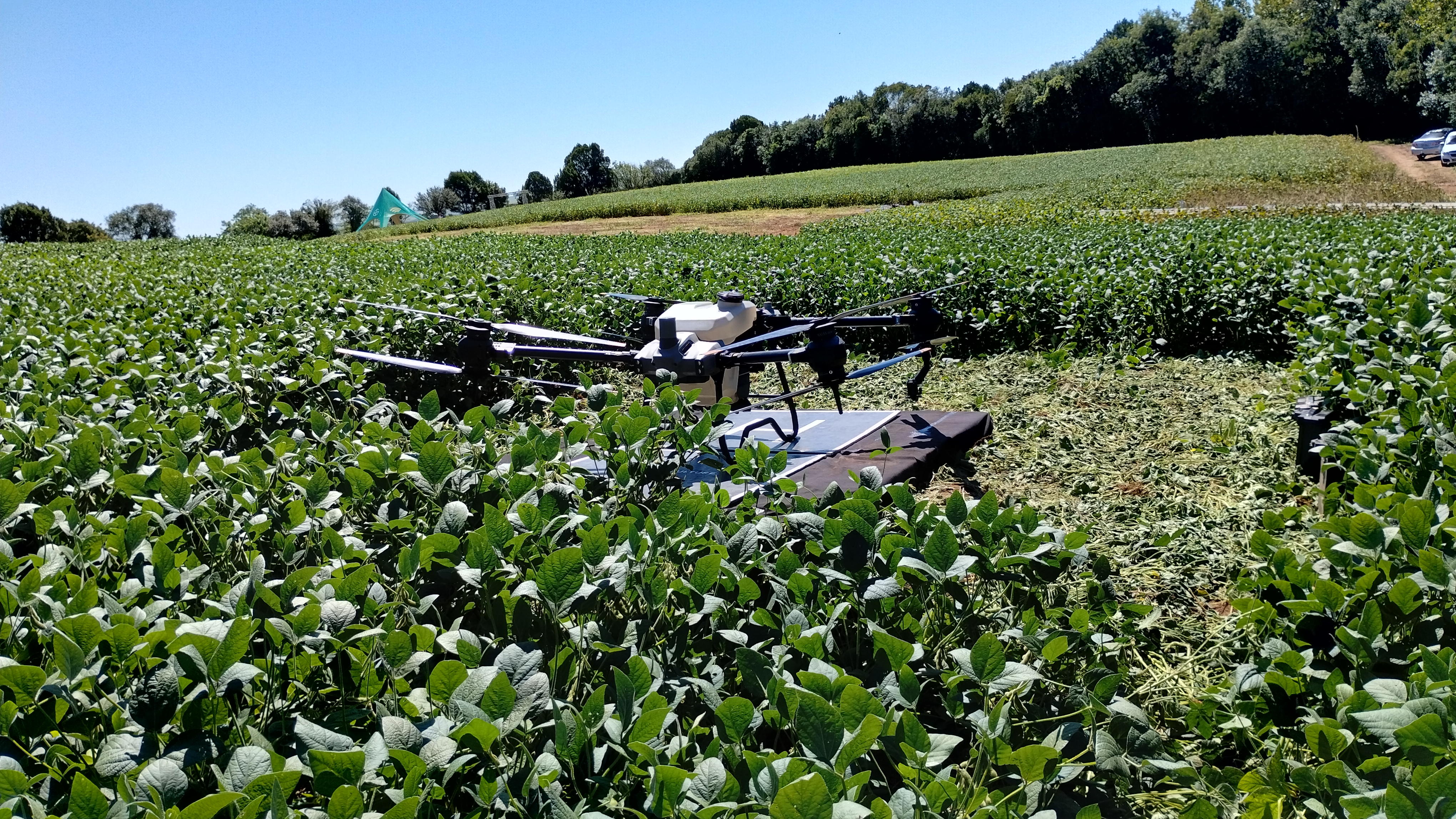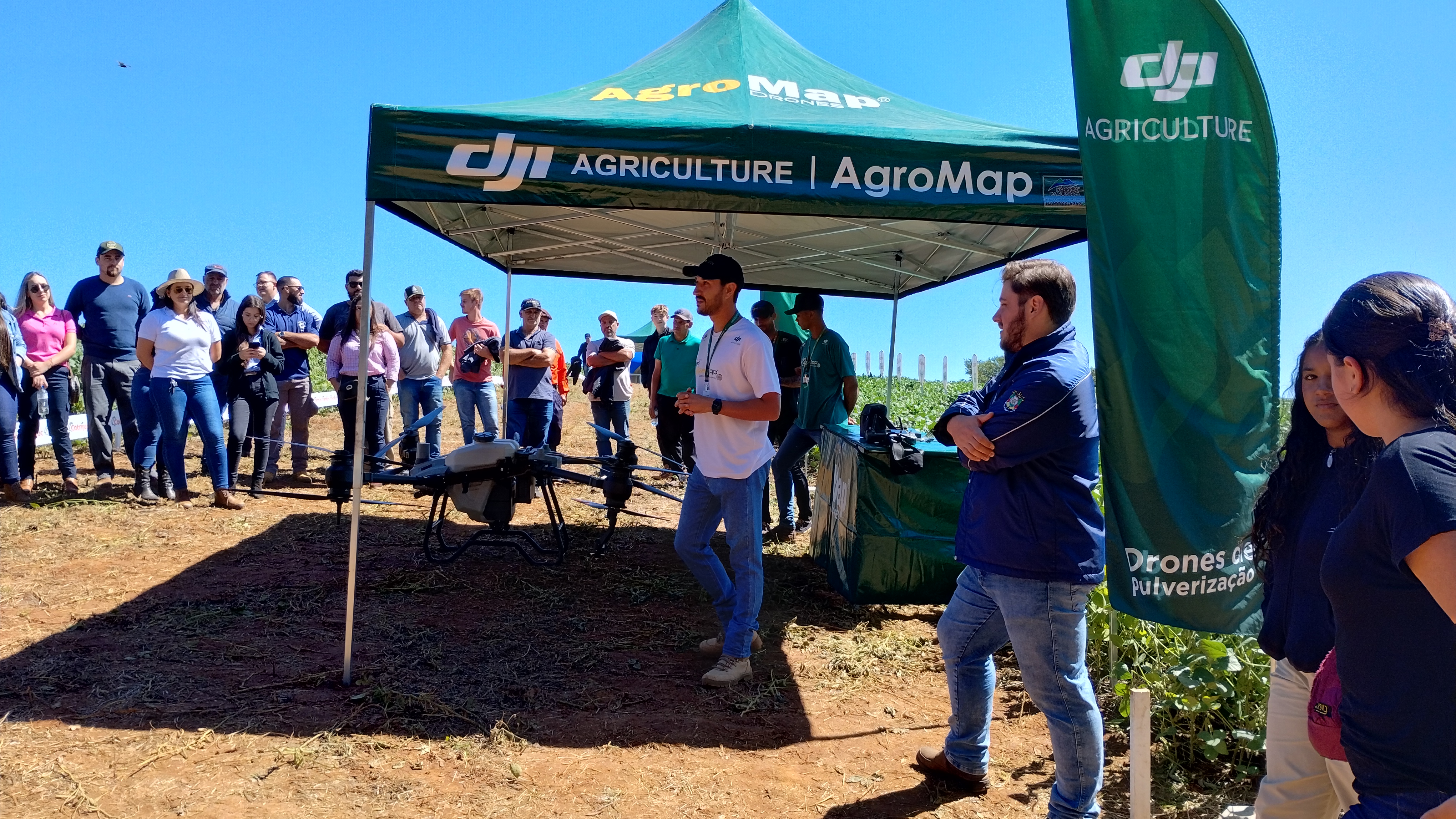 Na última estação, os/as participantes puderam ver uma demonstração de drones de pulverização. O apresentador destacou o valor agregado pelo drone à propriedade, expondo que atualmente compensa tanto para o grande como para o pequeno produtor a utilização dos drones.