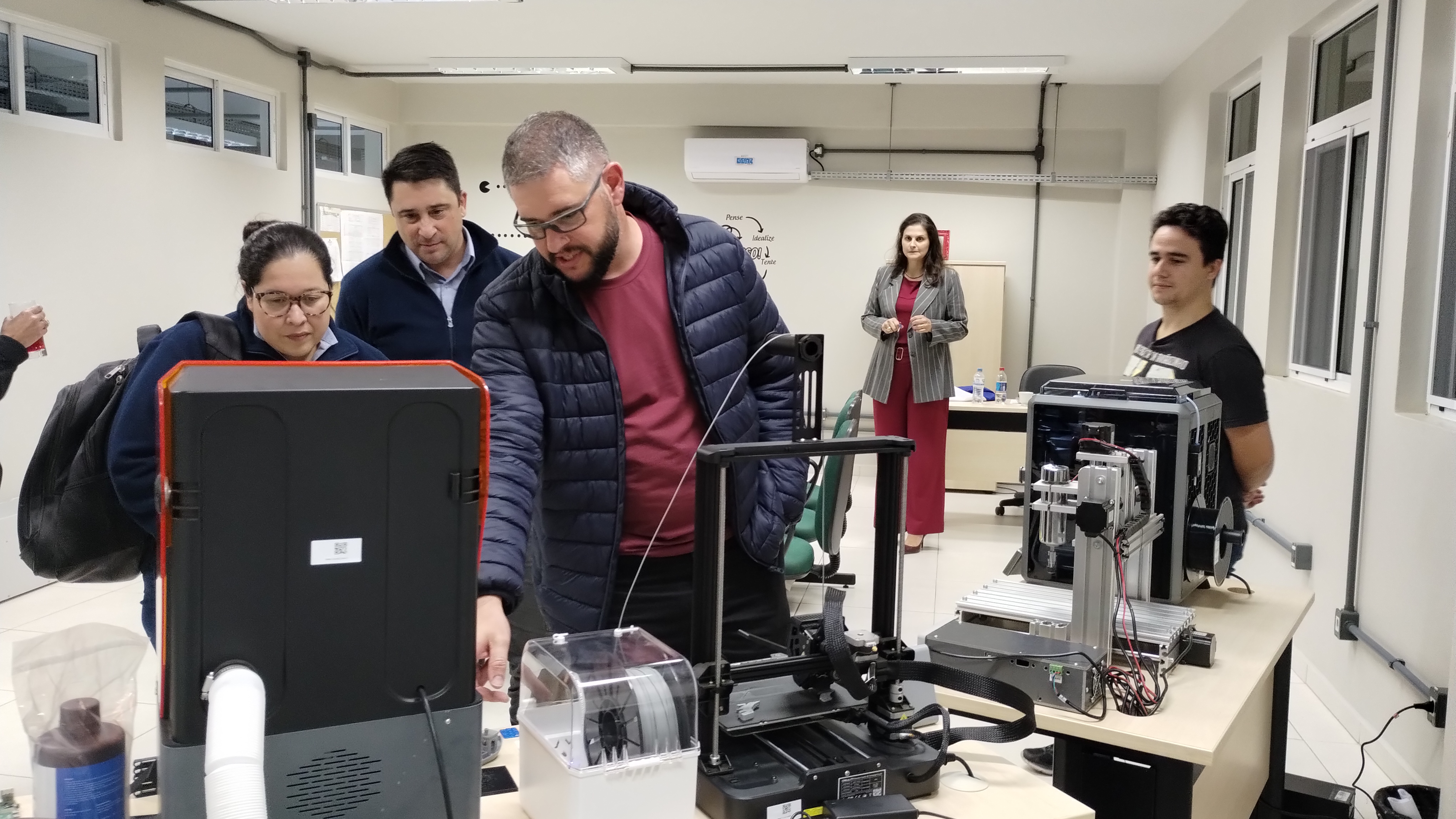 Para finalizar aconteceu uma visita guiada, que teve início na sala do Núcleo de Inovação e Transferência Tecnológica (NIT), onde foi montada uma pequena mostra do que o Labmaker. A visita seguiu pela biblioteca, eixo de produção alimentícia e um laboratório do curso de administração.