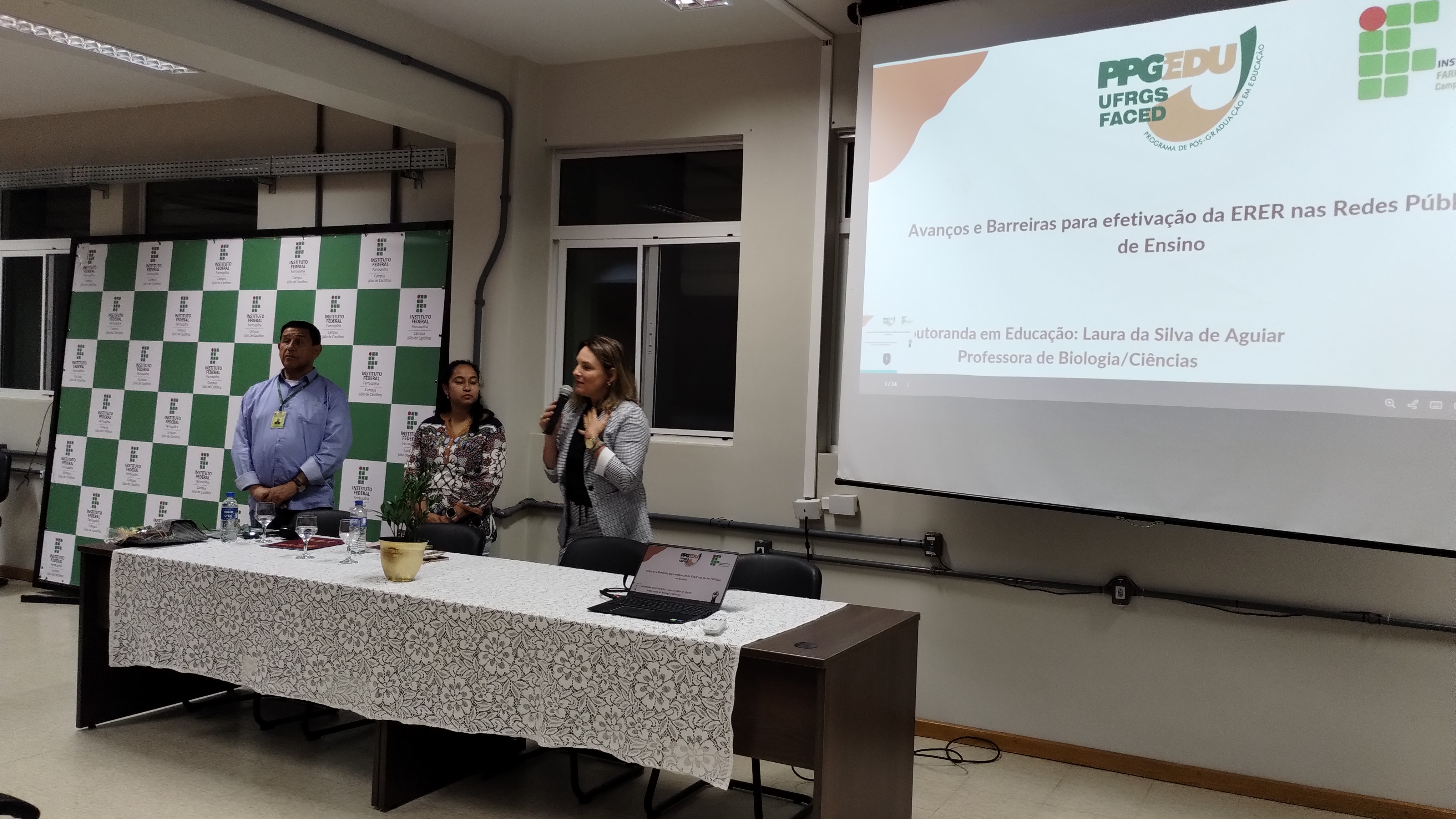 Com o tema “Avanços e barreiras para efetivação da Educação para as Relações Étnico-Raciais (ERER) nas escolas públicas”, a palestra foi ministrada por Laura da Silva de Aguiar, mestre e doutoranda em Educação pela Universidade Federal do Rio Grande do Sul (UFRGS). Ela é egressa do curso técnico em agropecuária e da licenciatura em ciências biológicas do IFFar – Campus de Júlio de Castilhos.