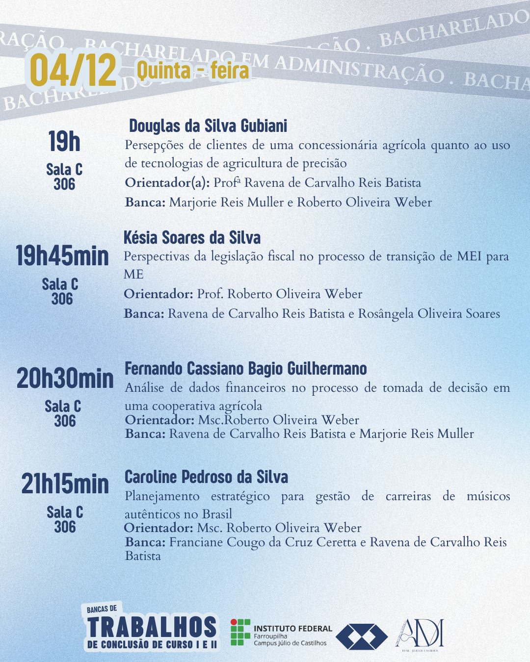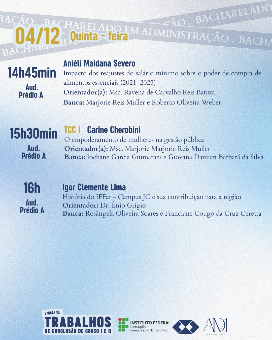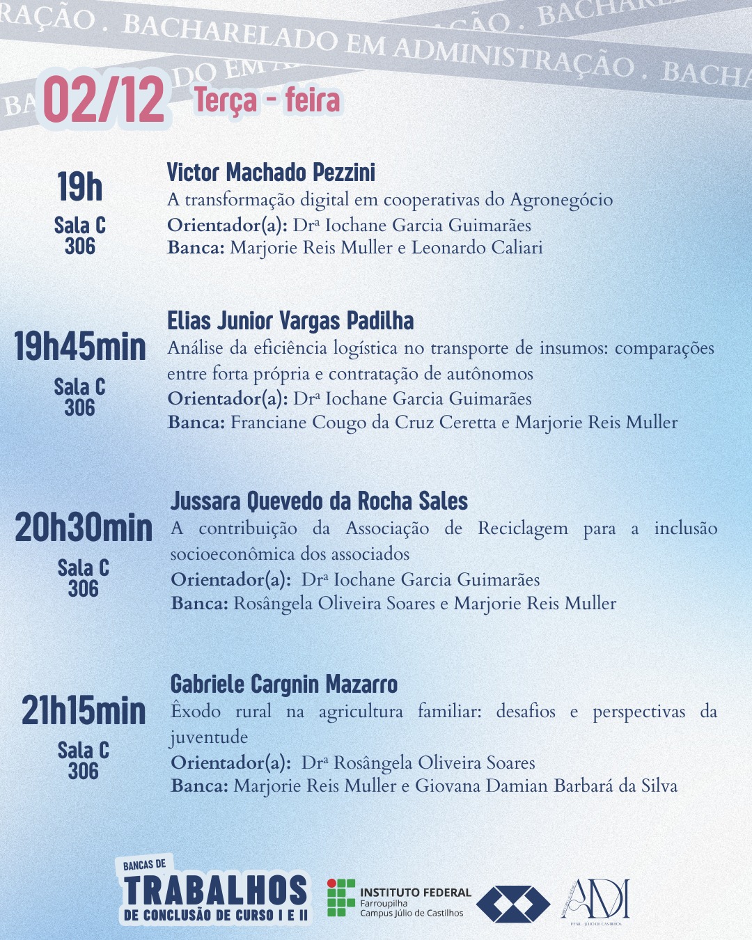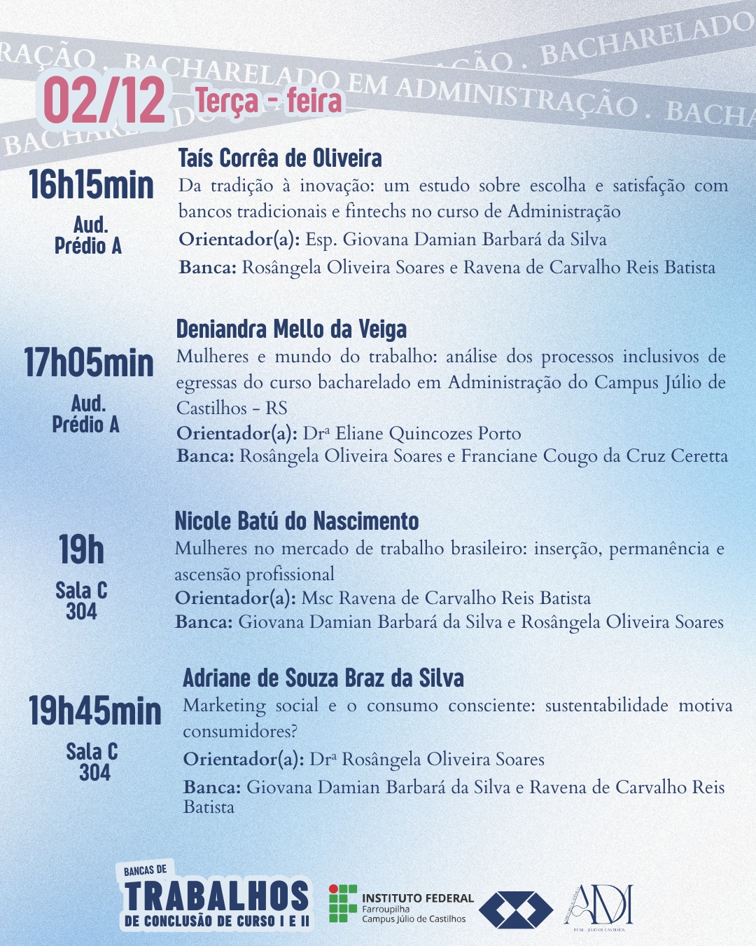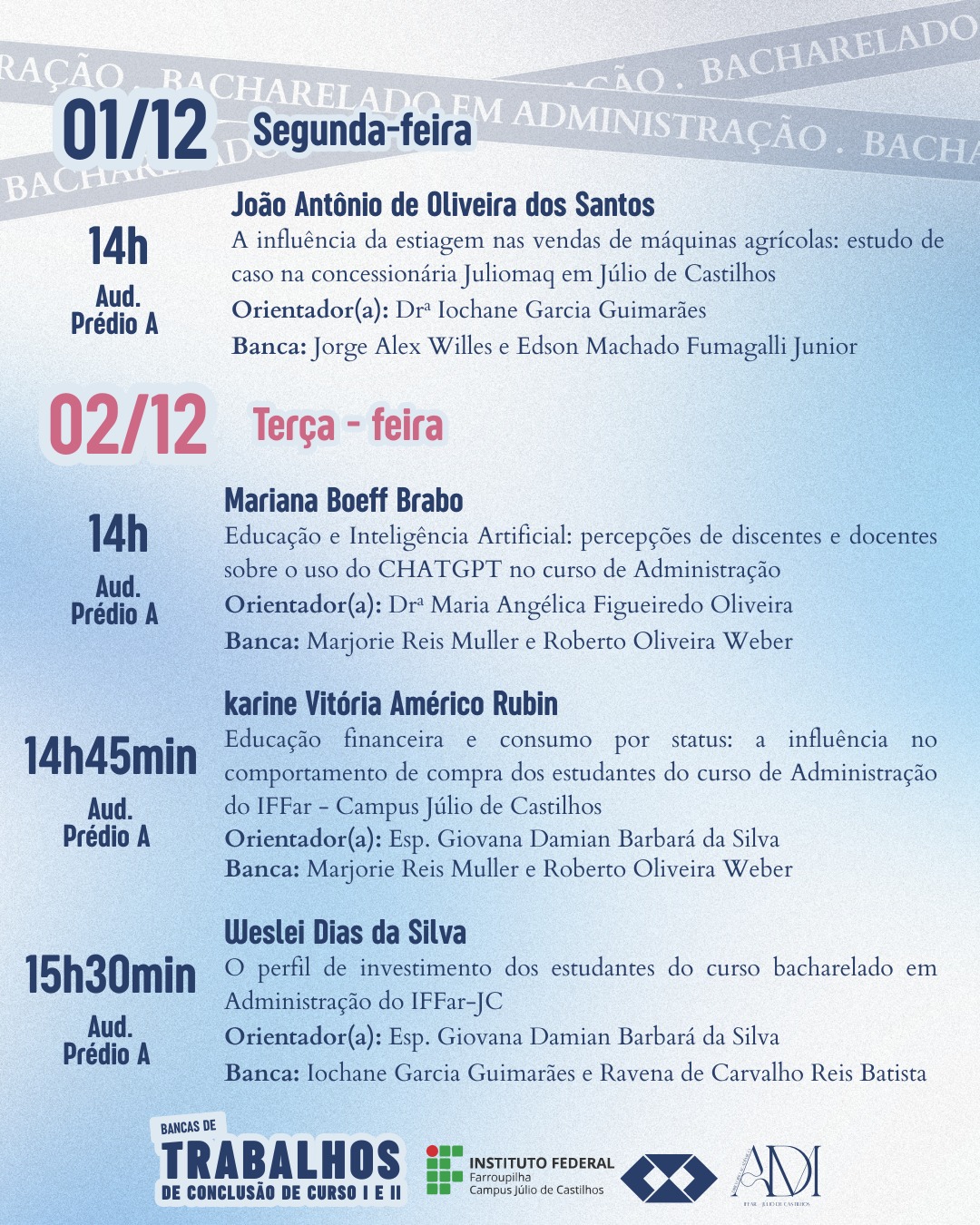 Entre os dias 1º, 2 e 4 de dezembro de 2025, o Campus Júlio de Castilhos contará com um dos momentos mais importantes para os acadêmicos do Curso de Bacharelado em Administração: as bancas de defesa dos Trabalhos de Conclusão de Curso I e II (TCCs).