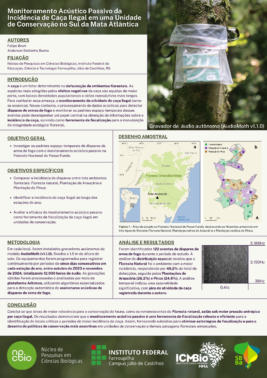 O estudo, "Monitoramento acústico passivo da incidência de caça ilegal em uma unidade de conservação no sul da Mata Atlântica", conduzido pelo acadêmico de Licenciatura em Ciências Biológicas do IFFar – Campus Júlio de Castilhos Felipe Brum e orientado pelo professor Anderson Saldanha Bueno, acaba de receber Menção Honrosa no II Congresso Brasileiro de Bioacústica (SBBa), realizado em outubro deste ano, em Florianópolis (SC). O trabalho foi apresentado em formato de pôster e concorreu com pesquisas de diversas instituições do país.