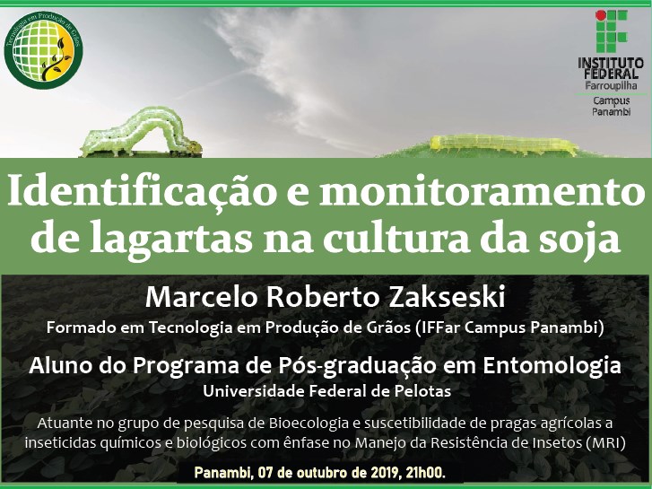 21h15min - 22h30min - Palestra com o Tecnólogo em Produção de Grãos e mestrando da UFPel, Marcelo Zakseski, sobre Identificação e monitoramento de lagartas na cultura da soja.