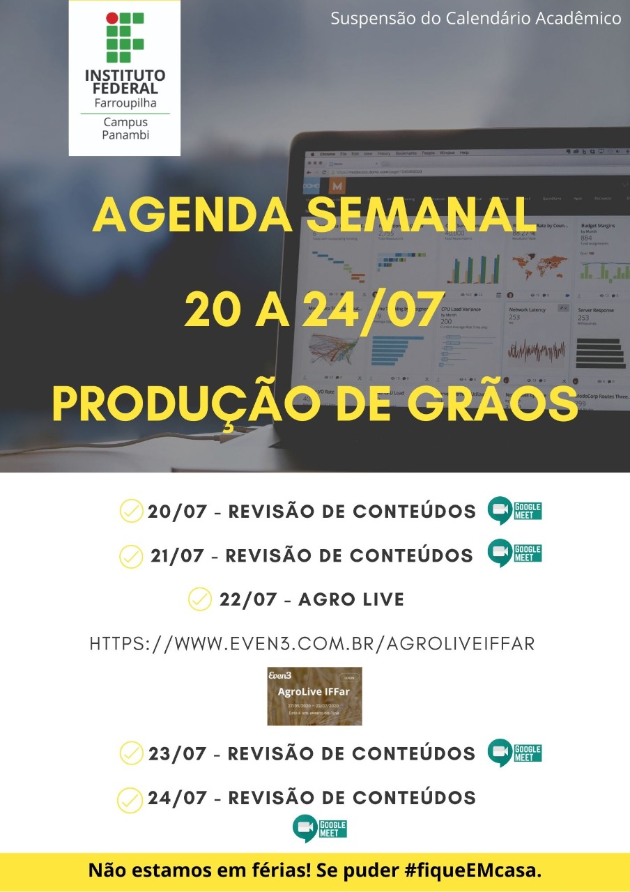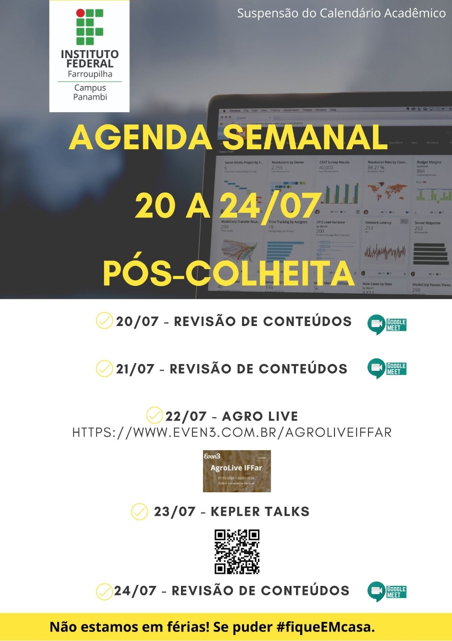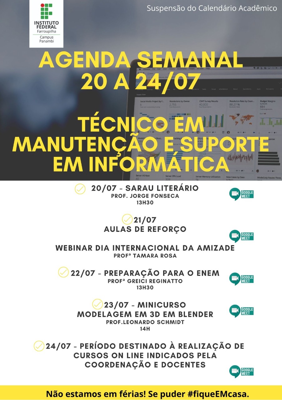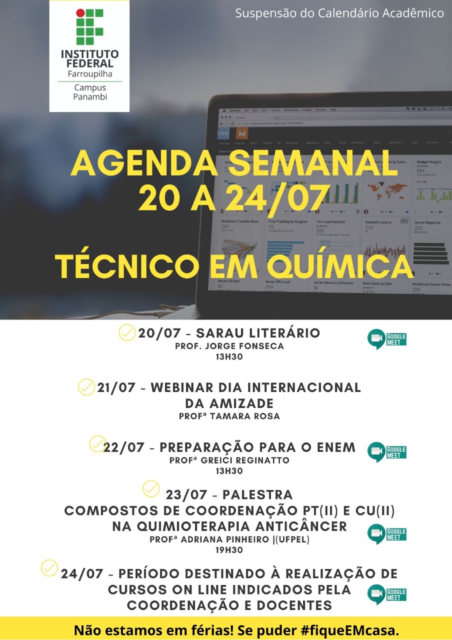A cada semana, uma agenda contendo as ações que serão desenvolvidas por cada curso será divulgada no portal institucional e nas redes sociais do Campus Panambi.