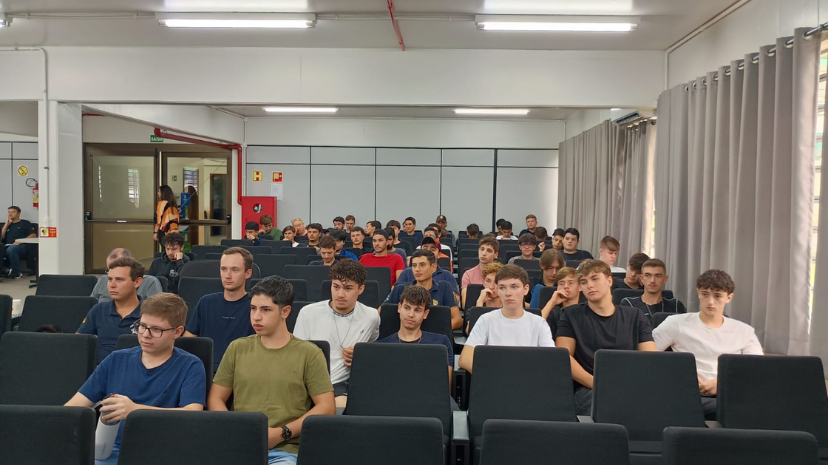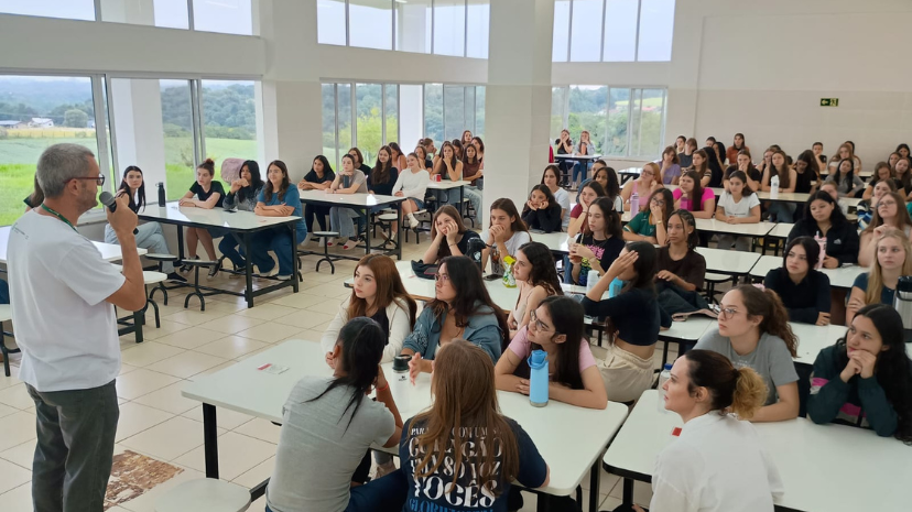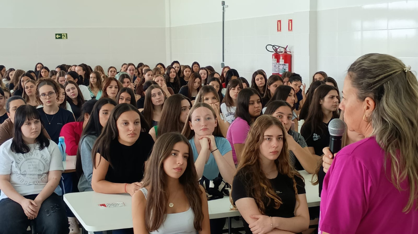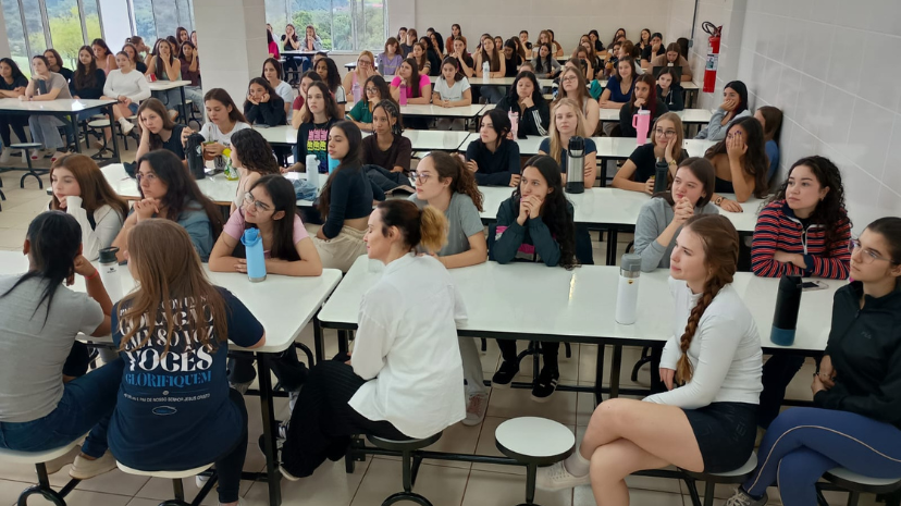 Para garantir a participação de todos os estudantes, a programação foi dividida em dois espaços e abordagens distintas, contemplando reflexões específicas. No auditório, os estudantes participaram de um debate conduzido pela psicóloga Nairana Marczewski de Melo, que trouxe discussões sobre masculinidade tóxica e violência contra a mulher. Durante sua fala, destacou como as construções sociais influenciam o comportamento masculino, muitas vezes reforçando padrões de agressividade, poder e dominação. Também abordou como essas práticas podem se iniciar ainda na juventude e evoluir para formas mais graves de violência, refletidas nos altos índices de feminicídio no Brasil.