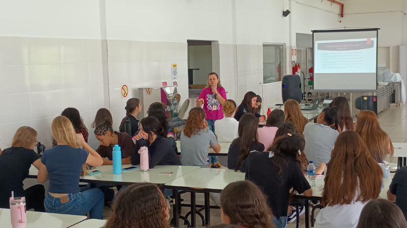 No refeitório, as estudantes participaram de uma atividade voltada ao autocuidado e à saúde feminina, conduzida pelas servidoras do campus Caroline Sissy Tronco e Débora Duarte Freitas, com a participação da Assistente Social Patrícia Pinno, do Centro de Referência da Mulher (CRM) de Panambi.