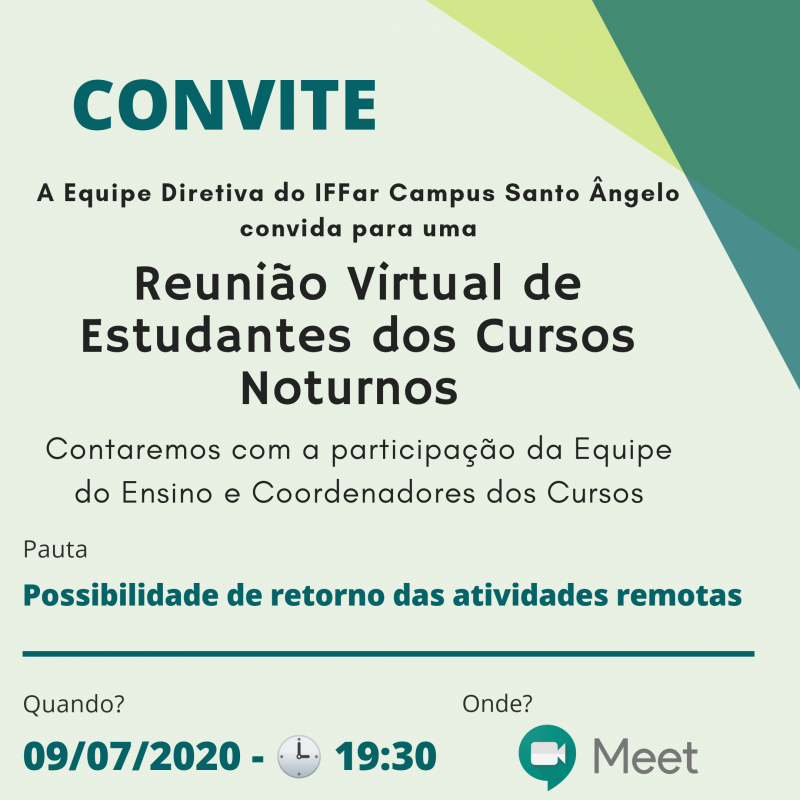 A Equipe Diretiva do IFFar Campus Santo Ângelo convida para uma Reunião Virtual de Estudantes dos Cursos Noturnos. Contaremos com a participação da Equipe do Ensino e Coordenadores dos Cursos.