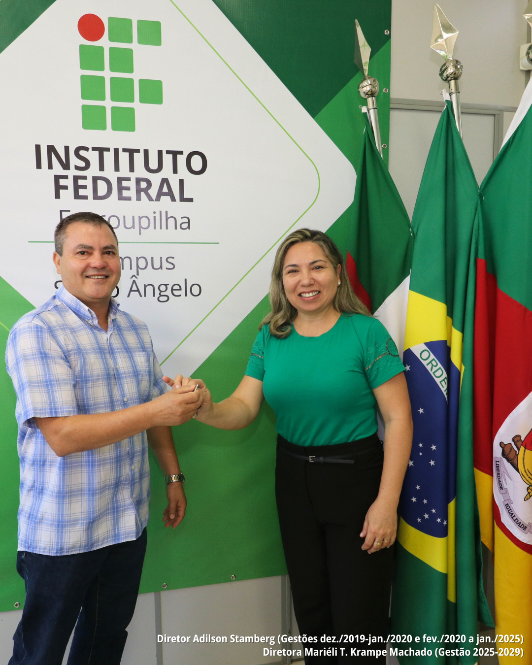 No dia 05 de fevereiro de 2025 ocorreu a reunião de transição da gestão do Instituto Federal Farroupilha - Campus Santo Ângelo. Na ocasião o Professor Adilson R. P. Stamberg - Diretor Geral na gestão de dez./2019 a jan./2020 e fev./2020 a 03 de fev./2025 compartilhou um balanço sobre as principais ações desenvolvidas ao longo deste período à nova equipe diretiva, sob a gestão da Professora Mariéli T. Krampe Machado - Diretora Geral eleita para a gestão 2025-2029. A nova gestão teve início oficialmente no dia 03 de fevereiro de 2025, conforme publicação no Diário Oficial. Este momento representa a continuidade do trabalho em prol da educação pública, gratuita e de qualidade, reafirmando nosso compromisso com o ensino, a pesquisa e a extensão.