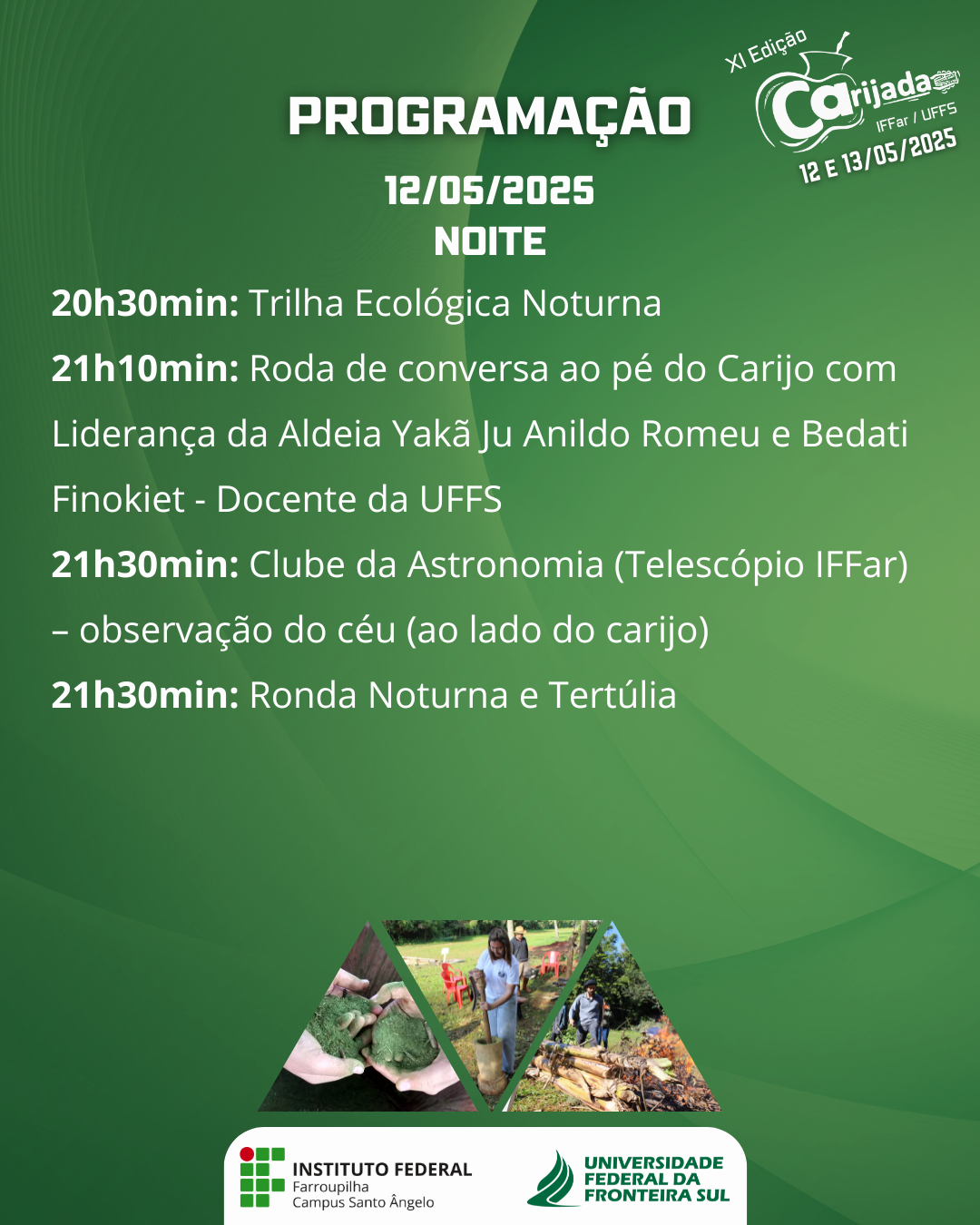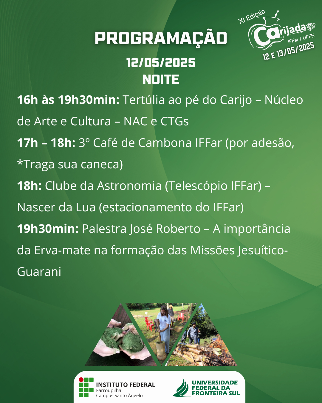 Entre os dias 12 e 13 de maio de 2025 estará acontecendo, nas dependências do Instituto Federal Farroupilha Campus de Santo Ângelo, mais uma carijada. Através de uma ação de extensão, em parceria com a UFFS Campus de Cerro Largo, buscamos reviver a prática ancestral de produção artesanal de erva-mate pelo método de carijo.