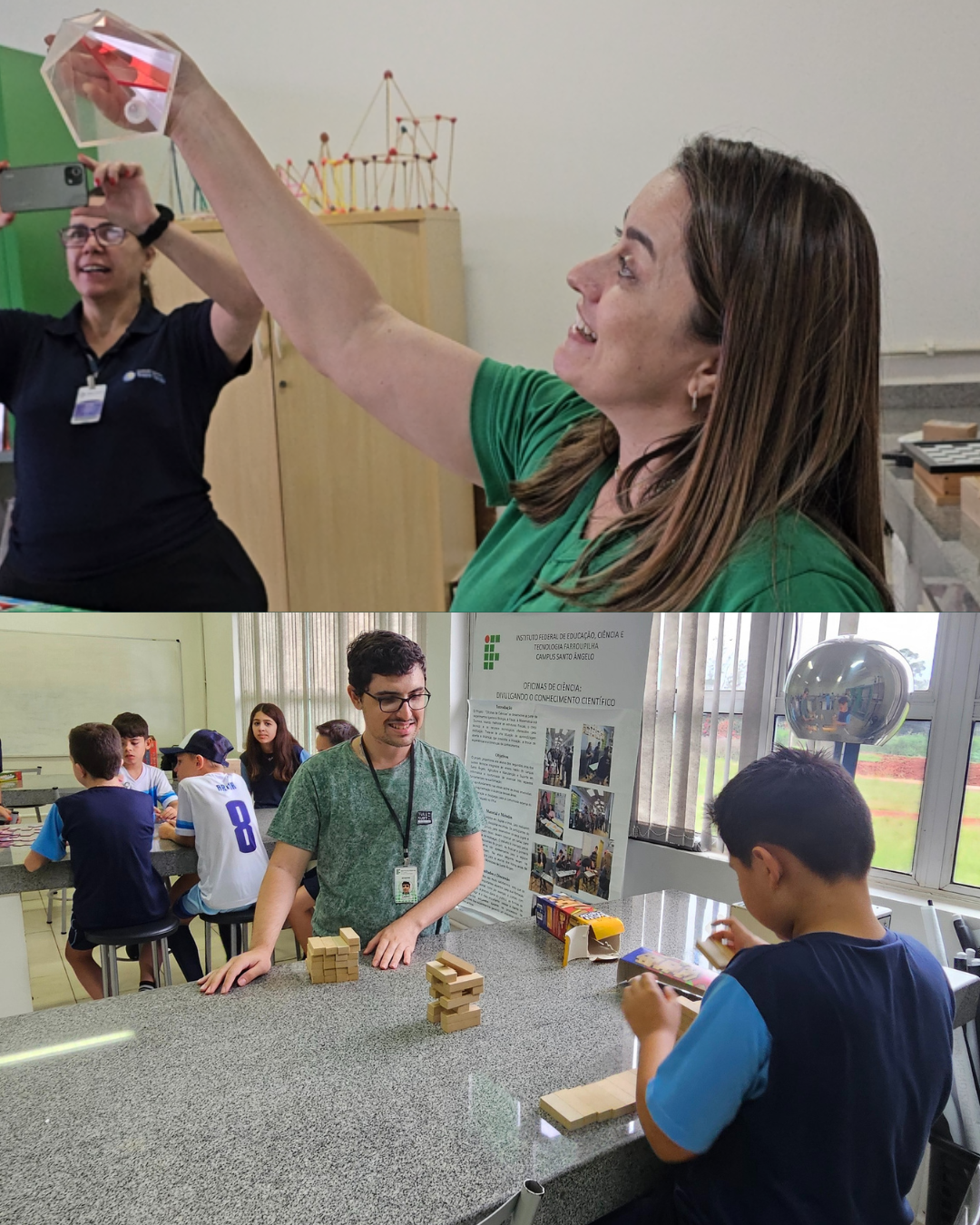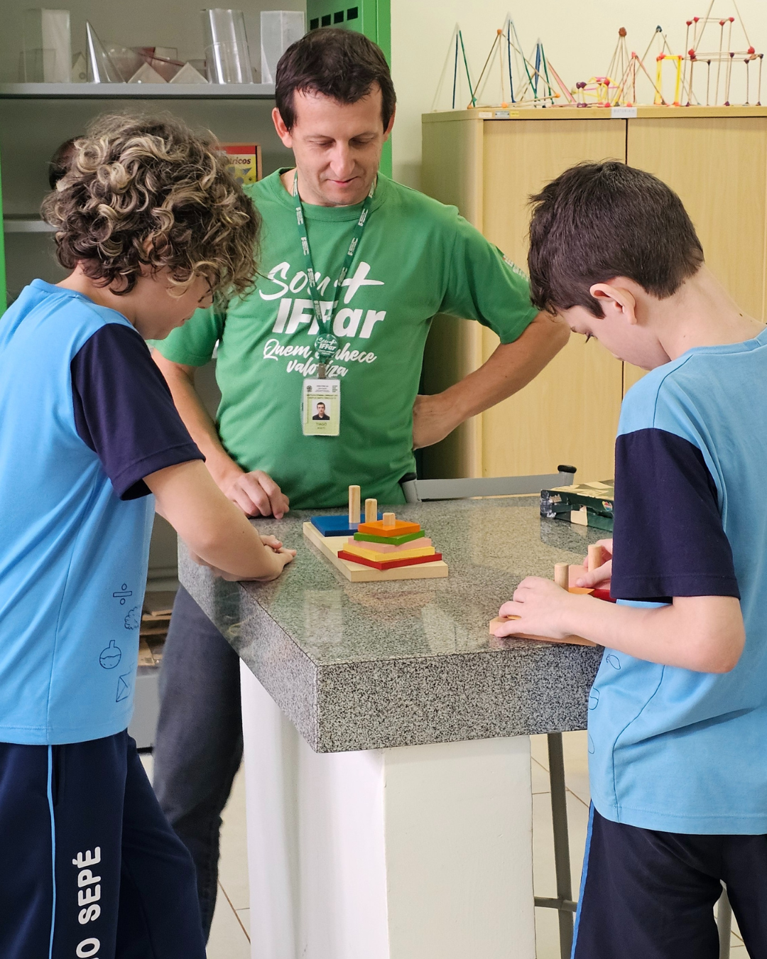 • Servidor Tiago Benetti (DAD), Professora Cristiane Stamberg (DE) e aluno Gabriel Paulus de Almeida – Laboratório de Física e Matemática