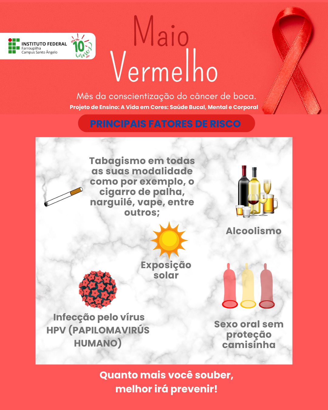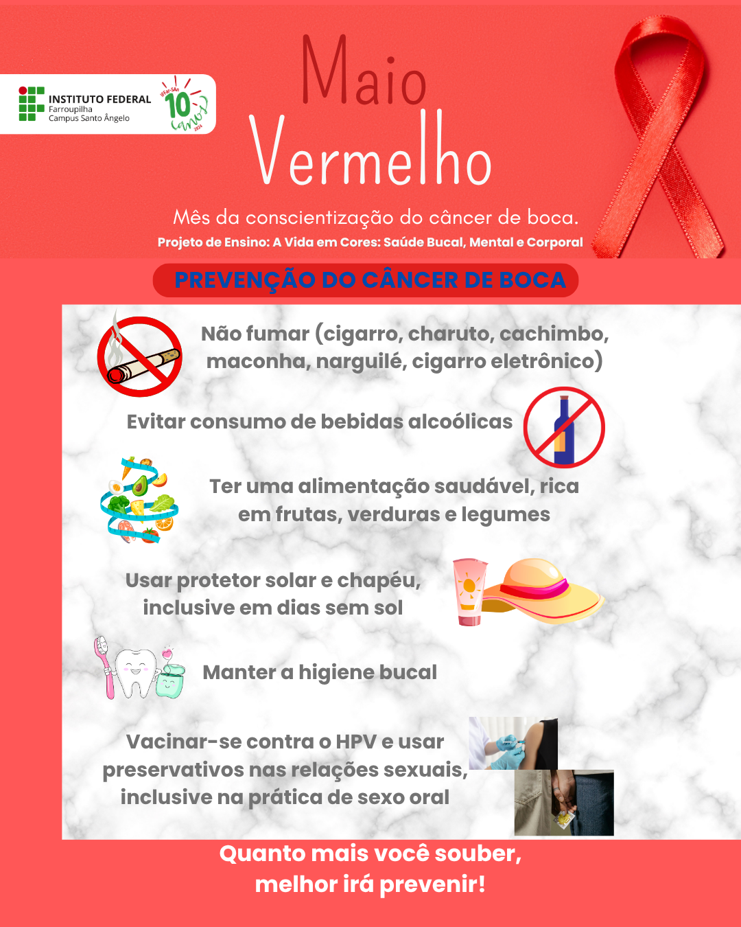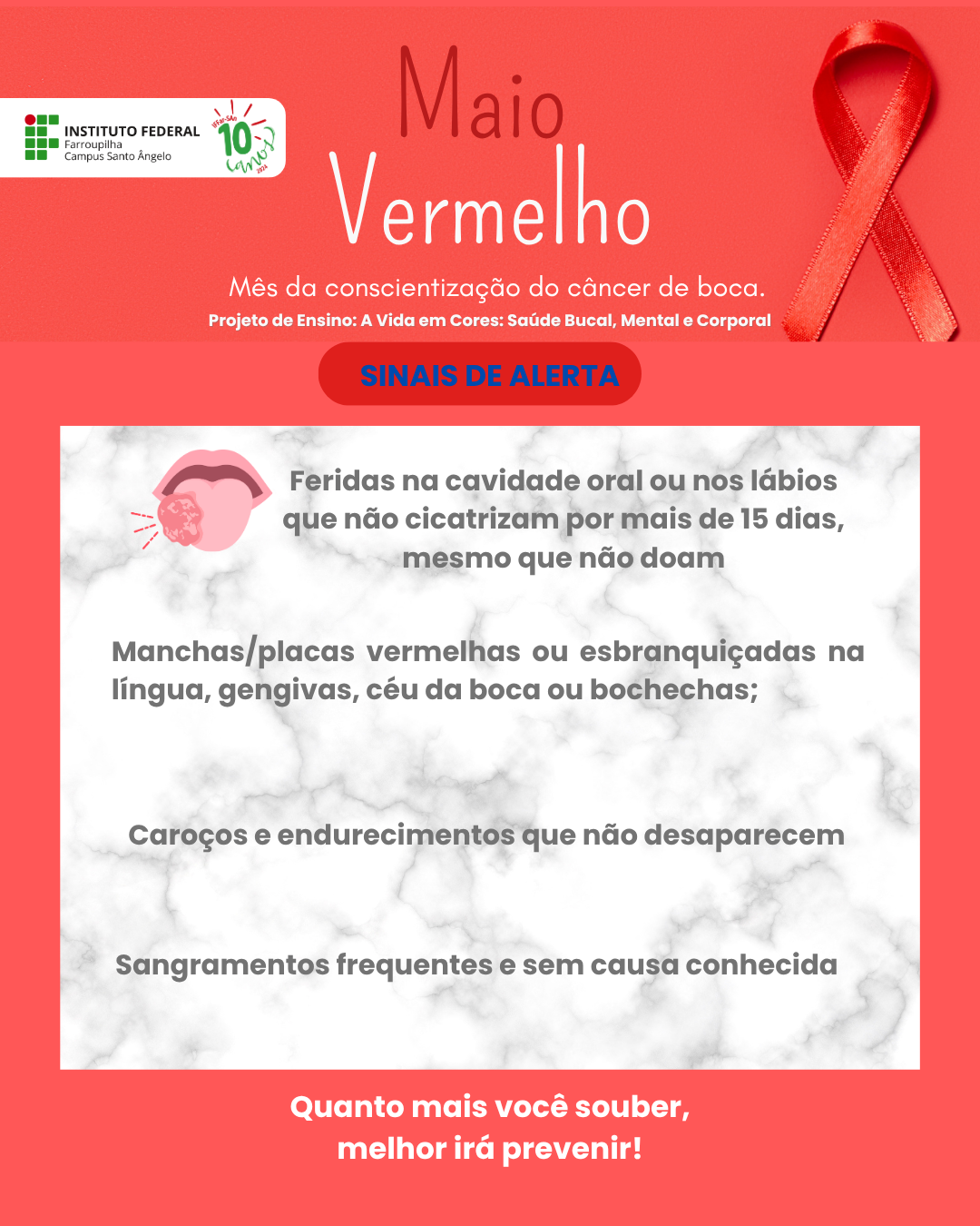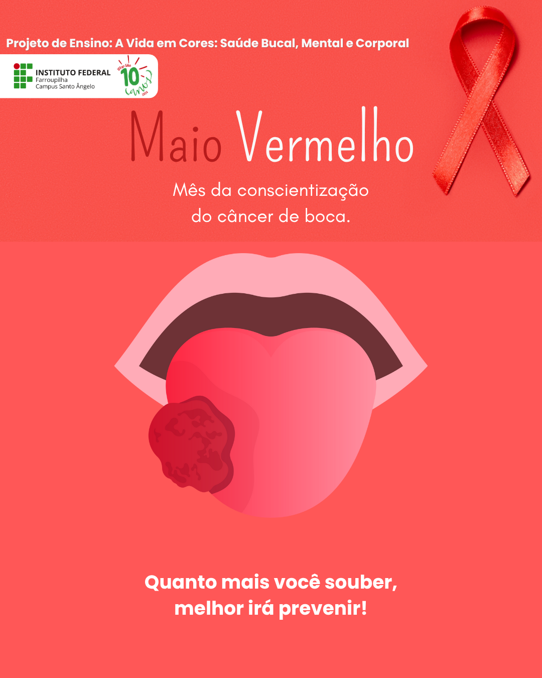 O Projeto de Ensino "A Vida em Cores: Saúde Bucal, Mental e Corporal", desenvolvido pelos(as) servidores(as) do setor de saúde do IFFar - Campus Santo Ângelo, está promovendo ações de conscientização sobre o câncer de boca, dentro da campanha nacional do Maio Vermelho.