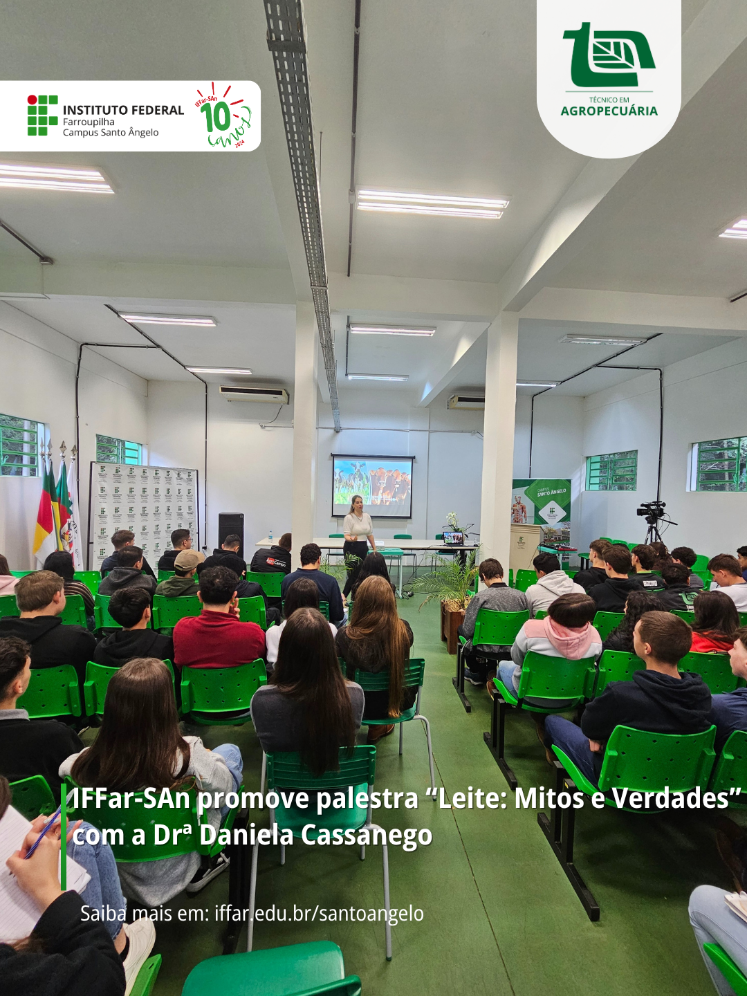 Na manhã do dia 19 de maio de 2025, estudantes do 1º ano do Curso Técnico em Agropecuária Integrado ao Ensino Médio participaram da palestra “Leite: Mitos e Verdades”, ministrada pela Drª Daniela Buzatti Cassanego. A atividade ocorreu no IFFar – Campus Santo Ângelo e integrou a proposta pedagógica do curso, aproximando os conteúdos de sala de aula da realidade do setor produtivo.