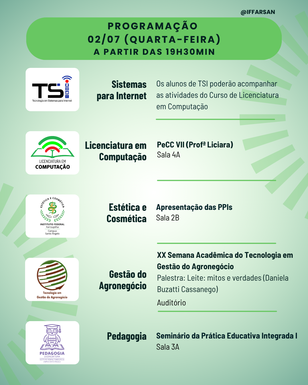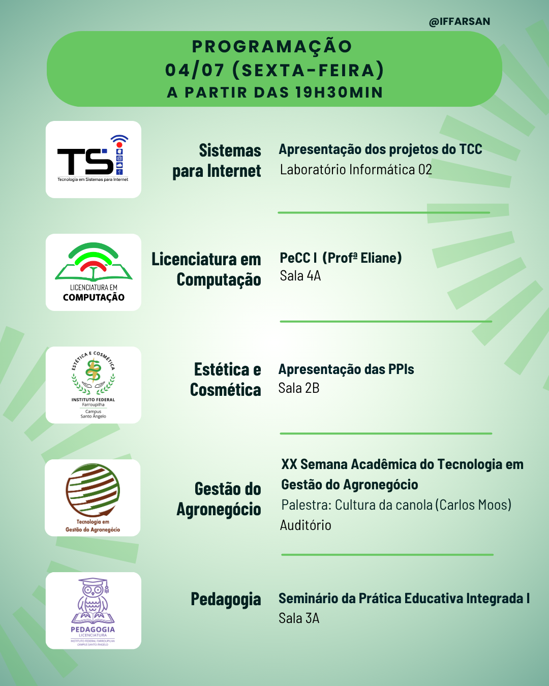 De 30 de junho a 4 de julho, nossos cursos de Sistemas para Internet, Licenciatura em Computação, Pedagogia, Estética e Cosmética, e Gestão do Agronegócio estarão reunidos em uma programação especial, repleta de apresentações de projetos, seminários, palestras e debates.