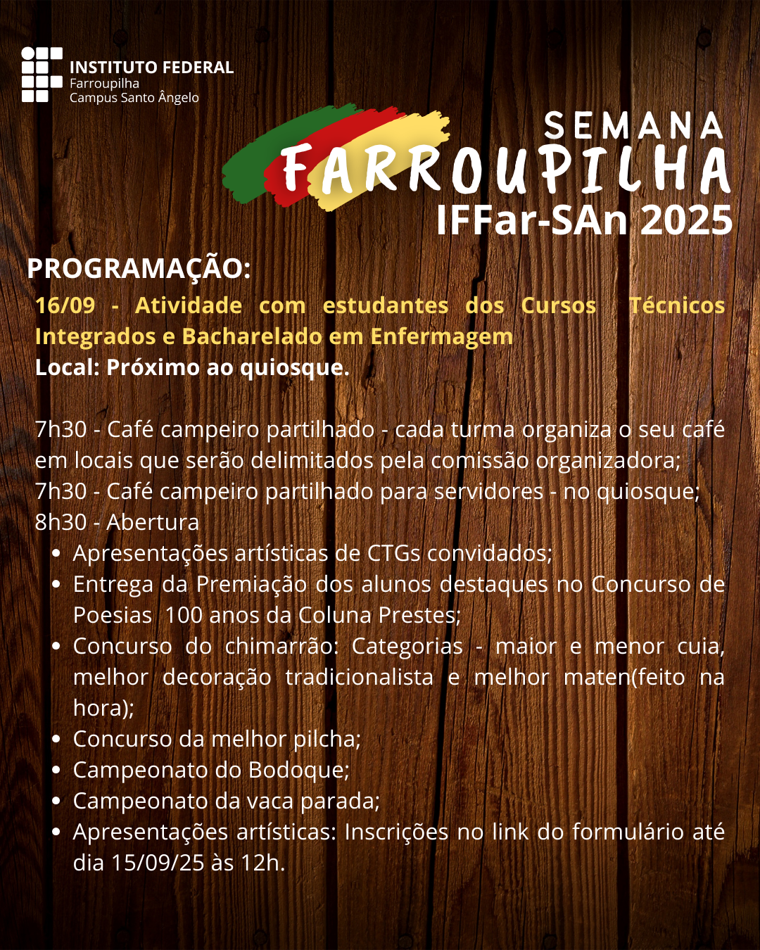 O Instituto Federal Farroupilha – Campus Santo Ângelo convida estudantes, servidores e comunidade acadêmica para participar das atividades da Semana Farroupilha 2025, que ocorrerão nas dependências do campus.