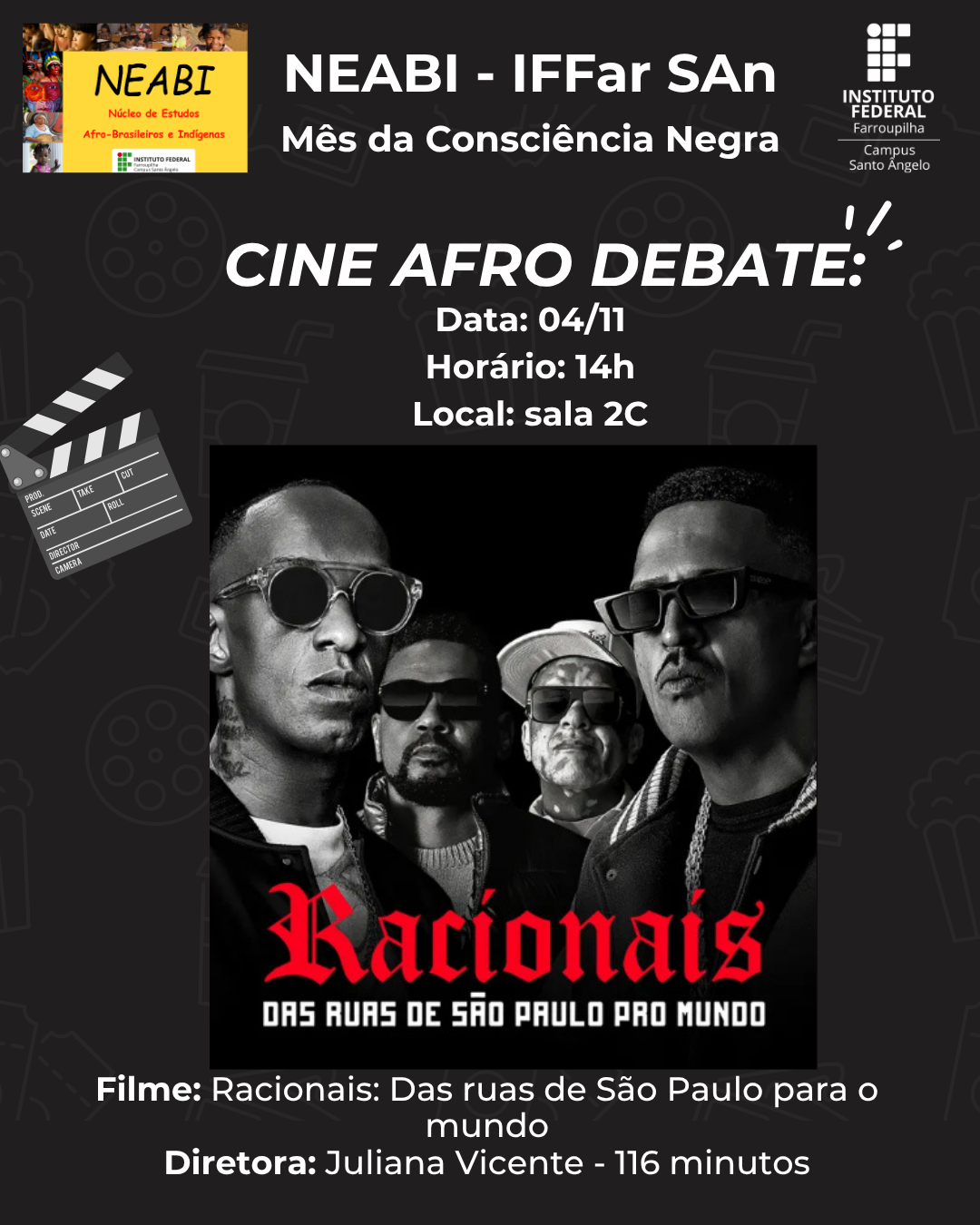 Em celebração ao Mês da Consciência Negra, o NEABI – Núcleo de Estudos Afro-Brasileiros e Indígenas convida toda a comunidade acadêmica para participar do CineAfro Debate, um ciclo de exibições e conversas sobre obras que retratam a cultura, a resistência e as lutas do povo negro.