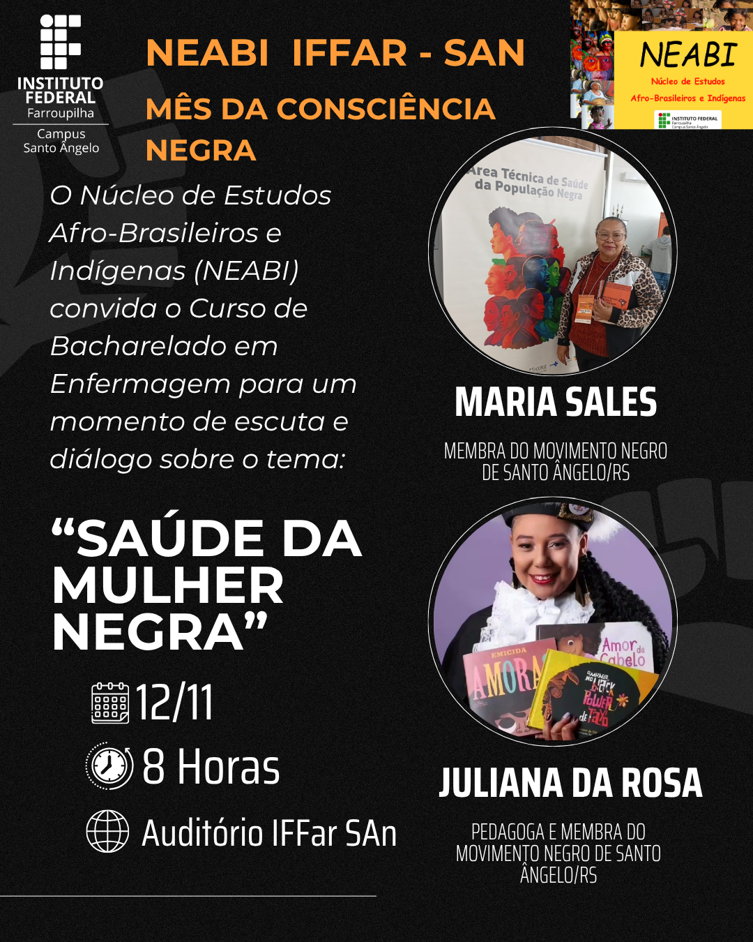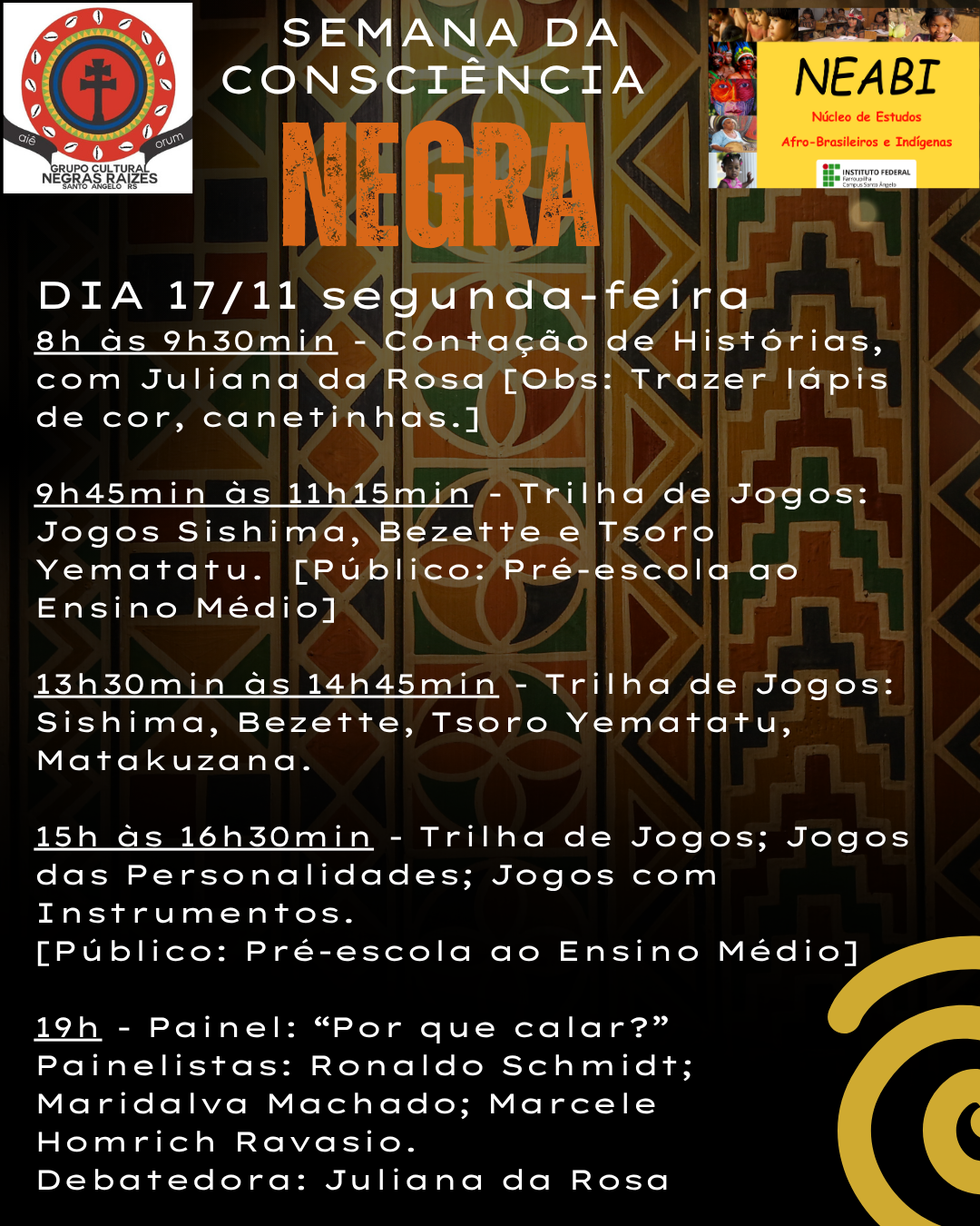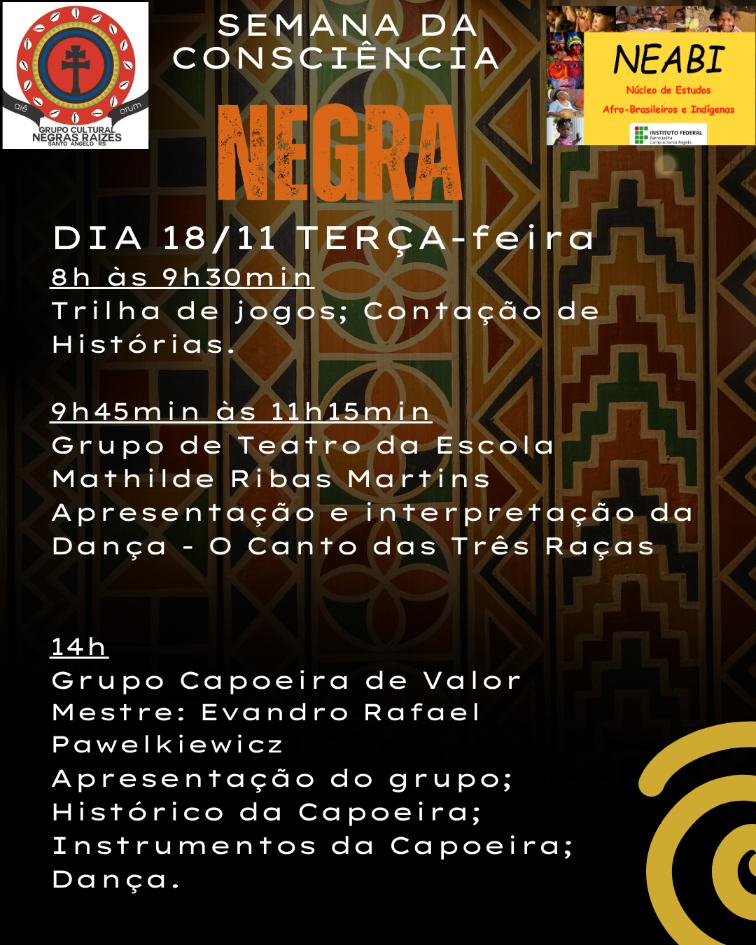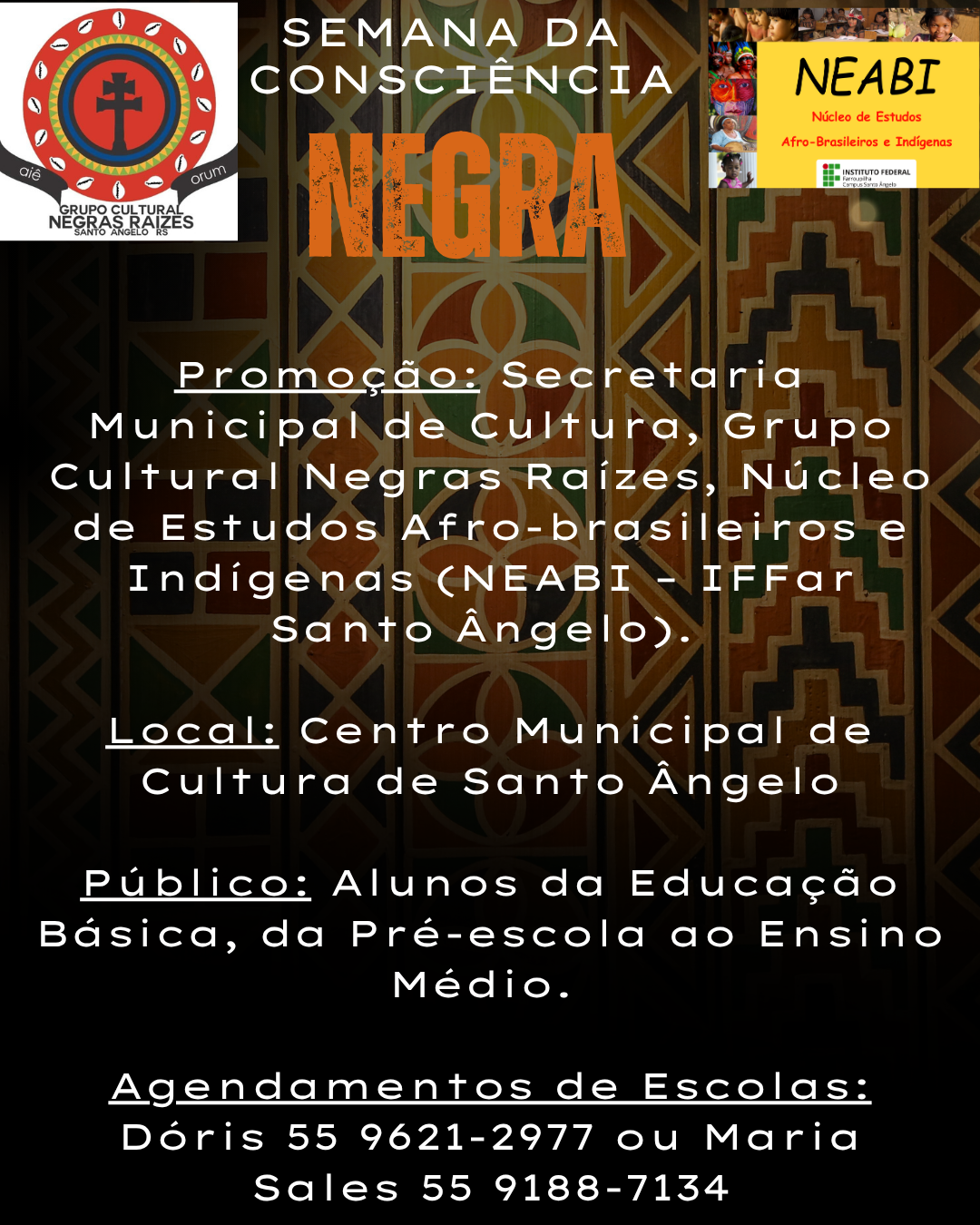 É nesse movimento que o IFFar – Campus Santo Ângelo, por meio do NEABI e do PET Letramento Racial Tec, em parceria com o Grupo Cultural Negras Raízes e a Secretaria Municipal de Cultura, realiza uma programação especial durante todo o mês. O objetivo é promover espaços de escuta, diálogo e estudo sobre os movimentos negros, visibilizando saberes historicamente silenciados e reafirmando o compromisso com uma educação pública, antirracista e libertadora.