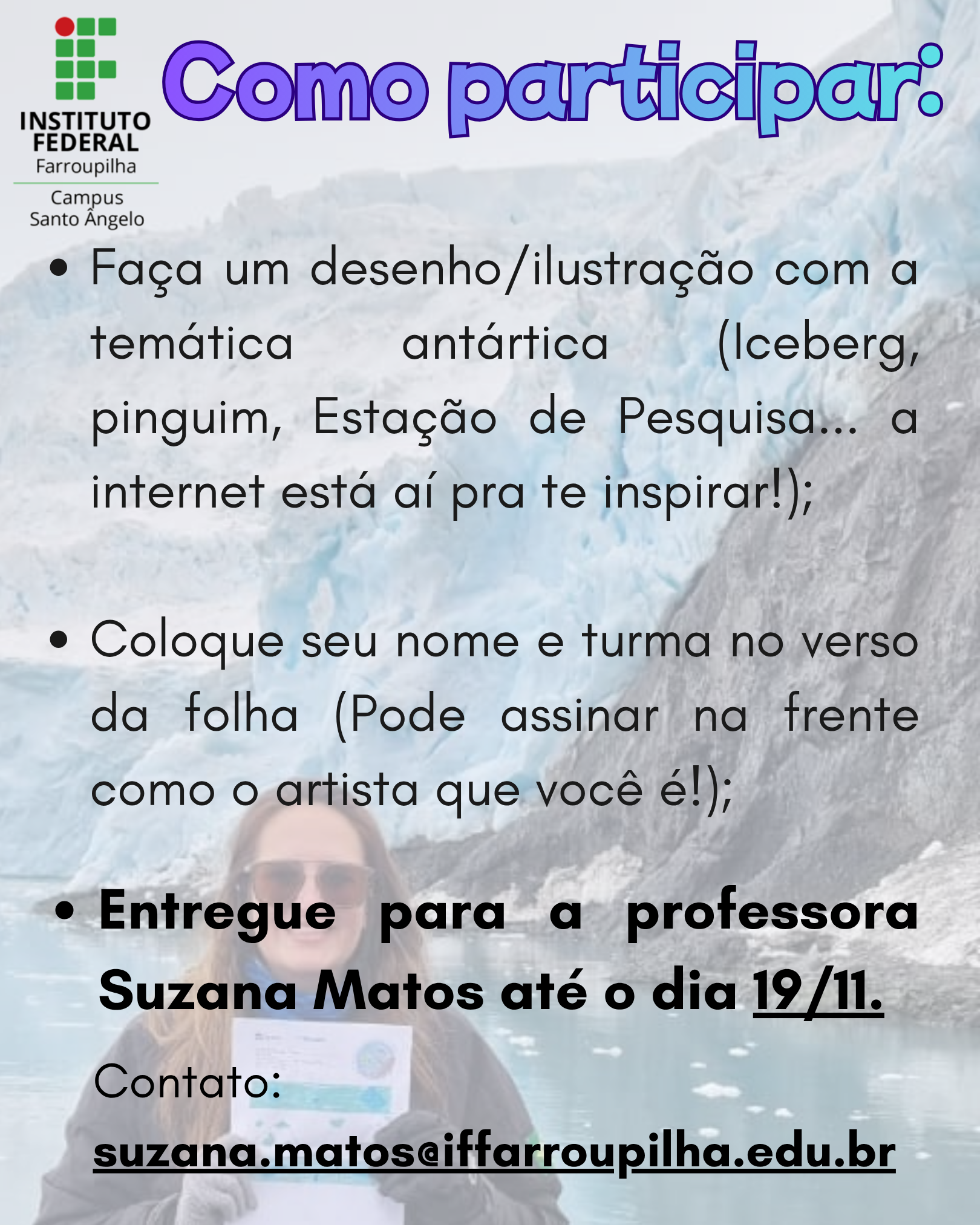 Em comemoração ao Dia Internacional da Antártica (01/12), o IFFar – Campus Santo Ângelo convida estudantes a produzirem desenhos inspirados no fascinante continente gelado — pinguins, icebergs, estações de pesquisa e muito mais!