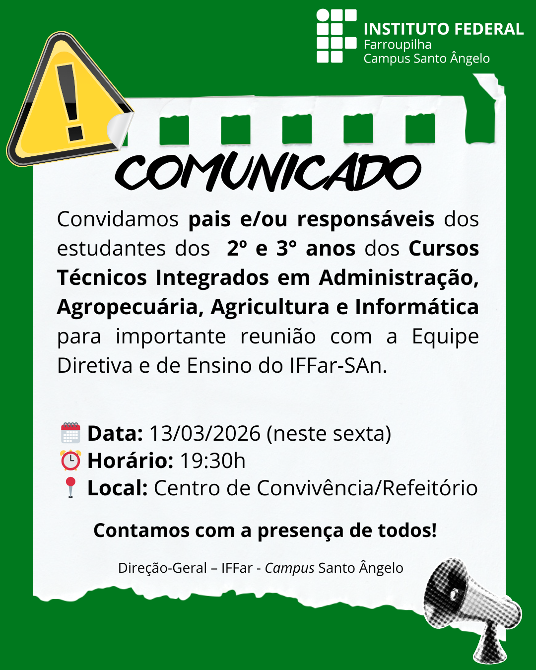 A Direção-Geral do campus destaca a importância da participação das famílias neste momento de troca de informações e acompanhamento da vida escolar dos estudantes.