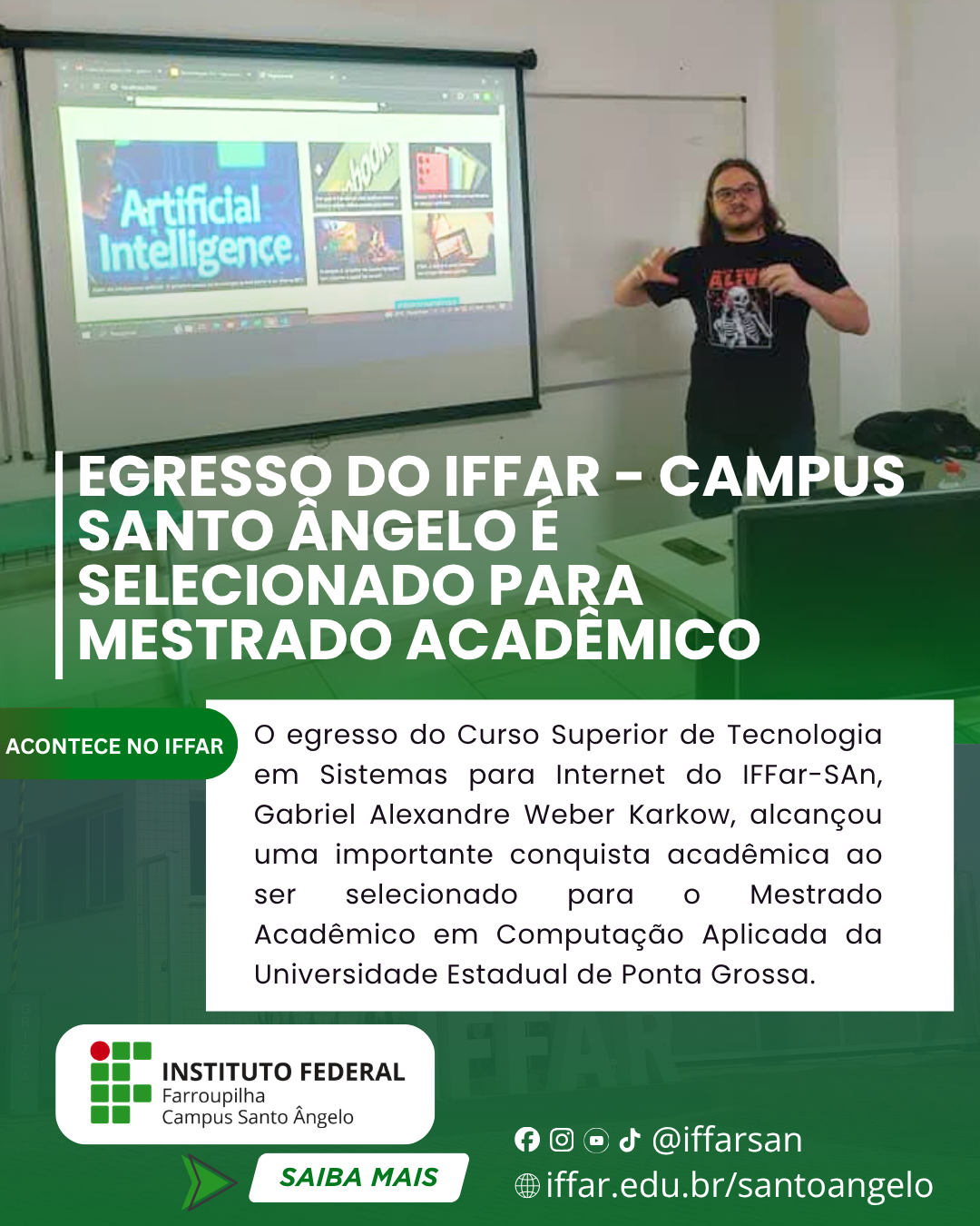 O egresso do Curso Superior de Tecnologia em Sistemas para Internet do Instituto Federal Farroupilha – Campus Santo Ângelo, Gabriel Alexandre Weber Karkow, alcançou uma importante conquista acadêmica ao ser selecionado para o Mestrado Acadêmico em Computação Aplicada da Universidade Estadual de Ponta Grossa, no Paraná.