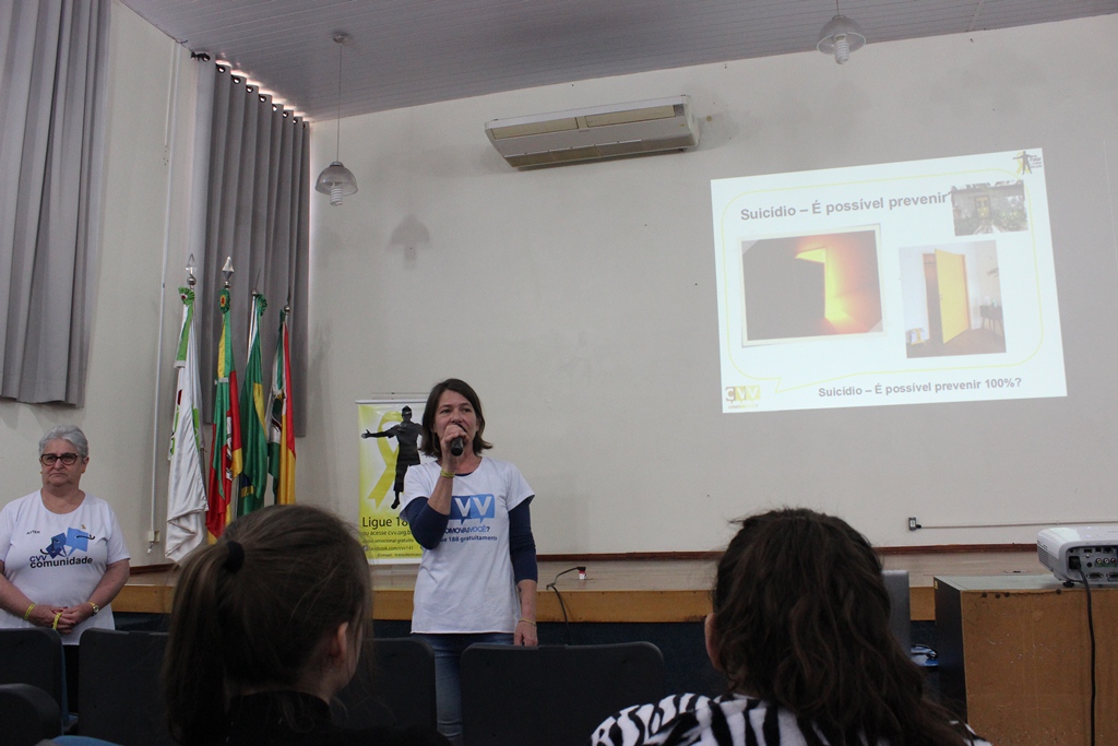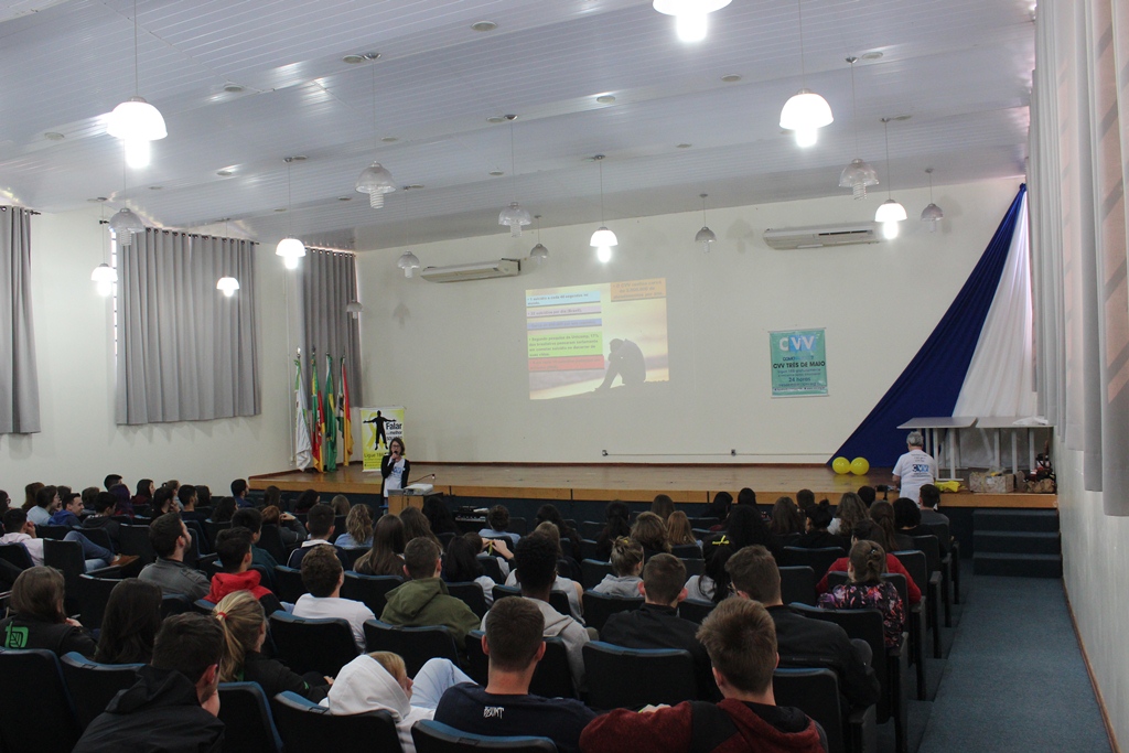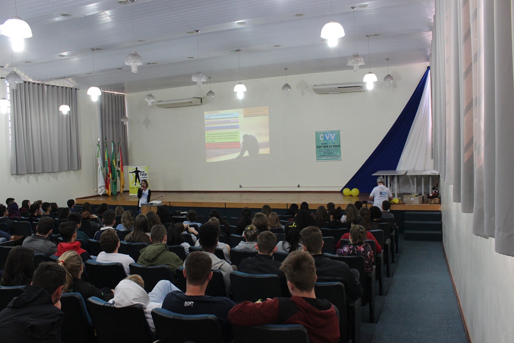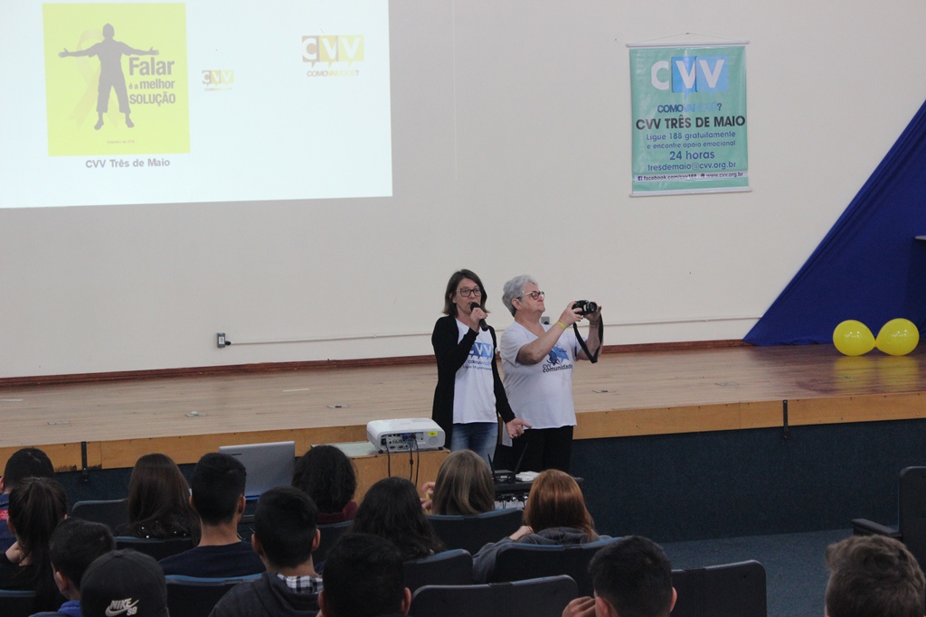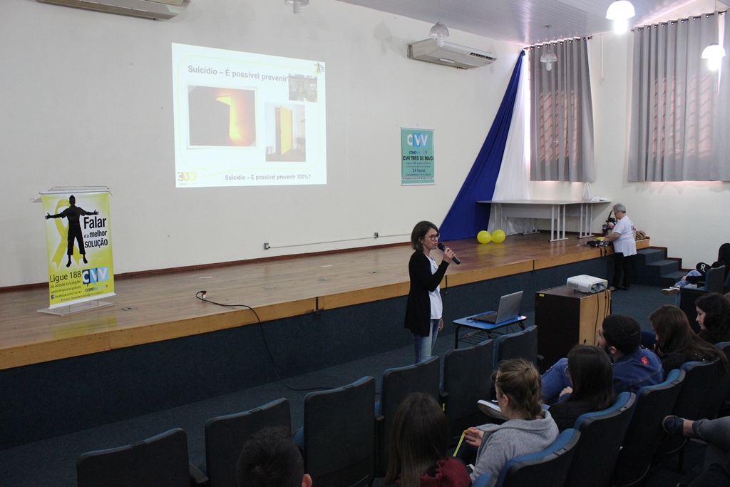 Na ocasião, as voluntárias do CVV de Três de Maio, Cláudia Regina Demo e Aster Hartmann, entregaram aos estudantes materiais informativos e apresentaram dados sobre o suicídio no Brasil e no Mundo. “O suicídio é um assunto complexo, pois ninguém se mata por um único motivo, mas a prevenção é possível e algumas ações podem ser feitas por todas as pessoas. Permitir que as pessoas desabafem e falem sobre seus sentimentos sem receber críticas é um meio de evitar que se pense na morte como solução para as dores”, destacaram as voluntárias.