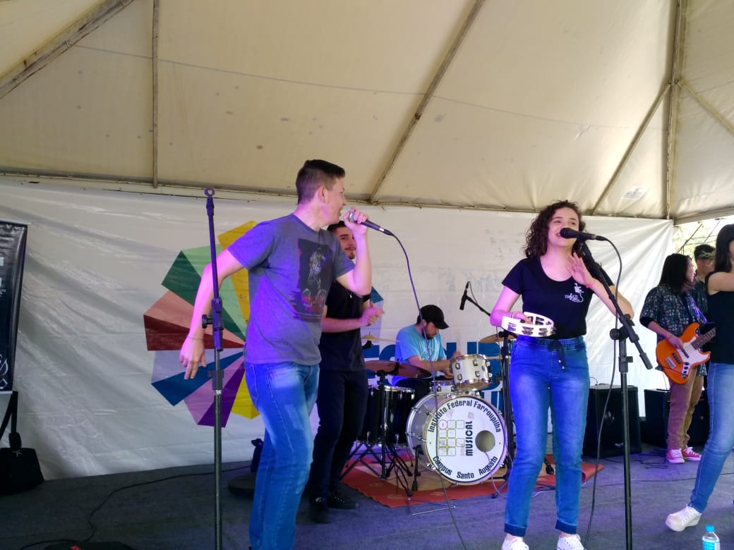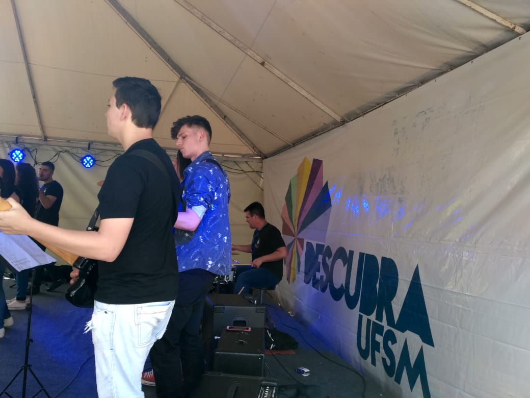 Durante a apresentação da Banda IF Musical no palco de shows do Descubra UFSM 2019, os egressos do IFFar – Campus Santo Augusto e ex-integrantes do projeto IF Musical, Eduardo Grenzel e Emanuel Santos (atuais estudantes da UFSM), foram convidados pelo grupo para se apresentarem com a Banda.
