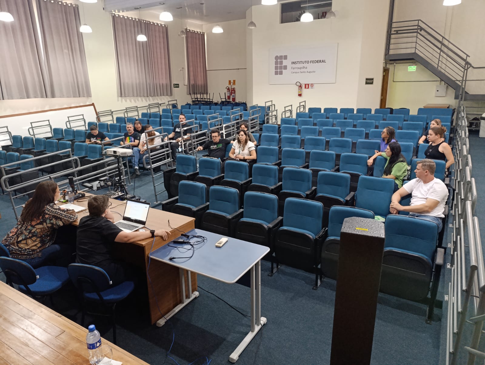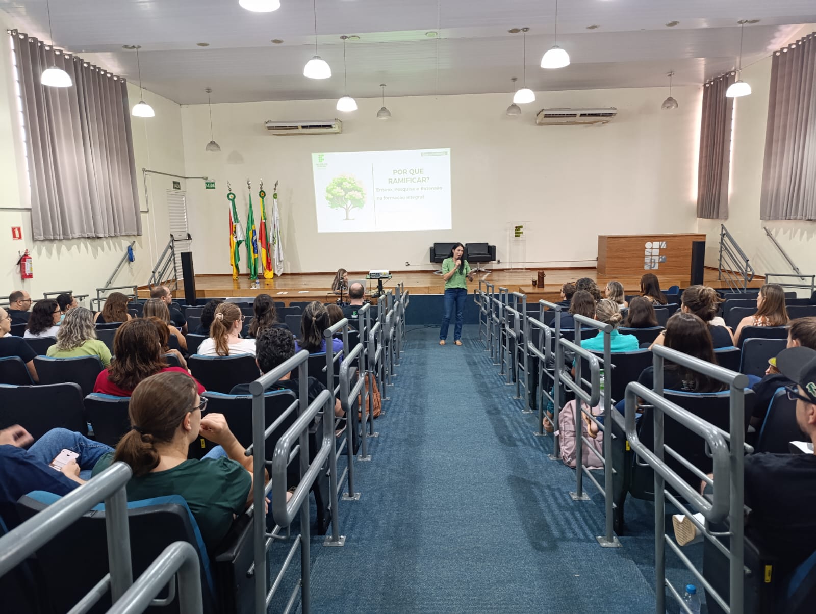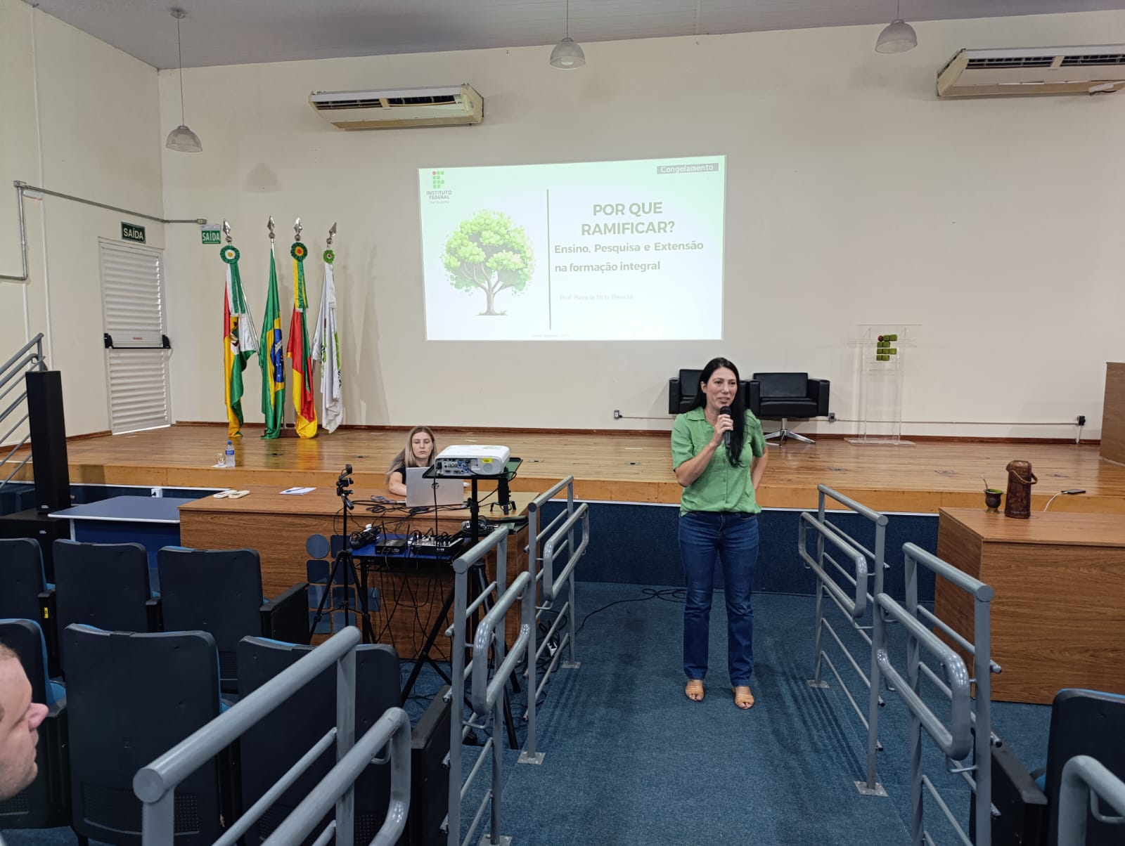 A programação continuou na quinta-feira, dia 06, às 8h, com a exibição do vídeo boas-vindas da Reitora Nídia Heringer, seguida pela palestra da Pró-Reitora de Ensino do IFFar, Patrícia Donitch, tendo como tema “Por que Ramificar? Ensino, Pesquisa e Extensão na formação integral”. Na sequência, aconteceram estudos em grupo, dos quais os resultados serão sistematizados na sexta-feira, dia 07, a partir das 8h.