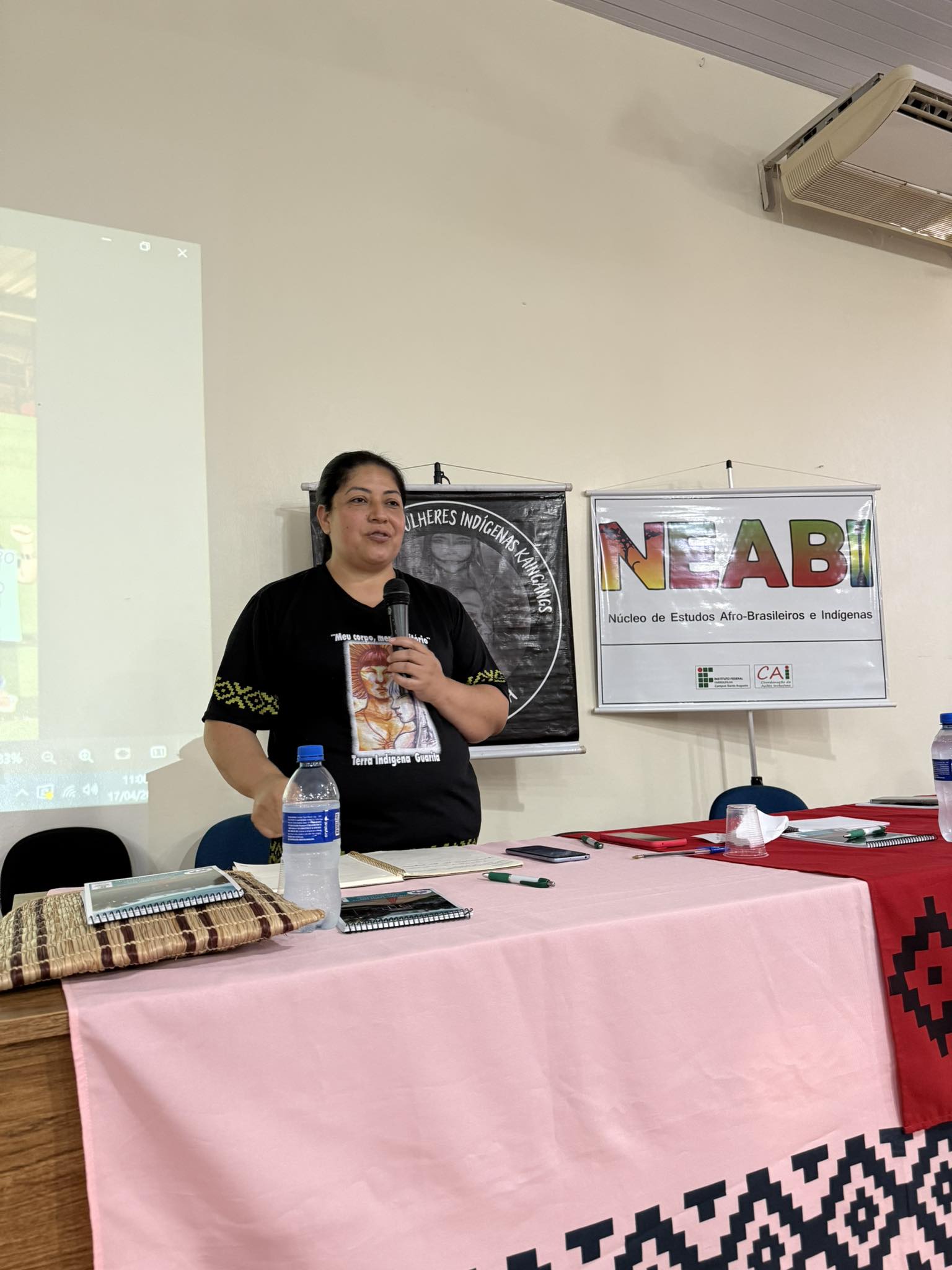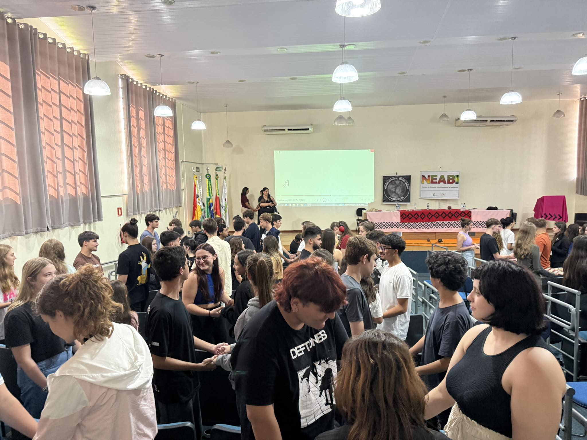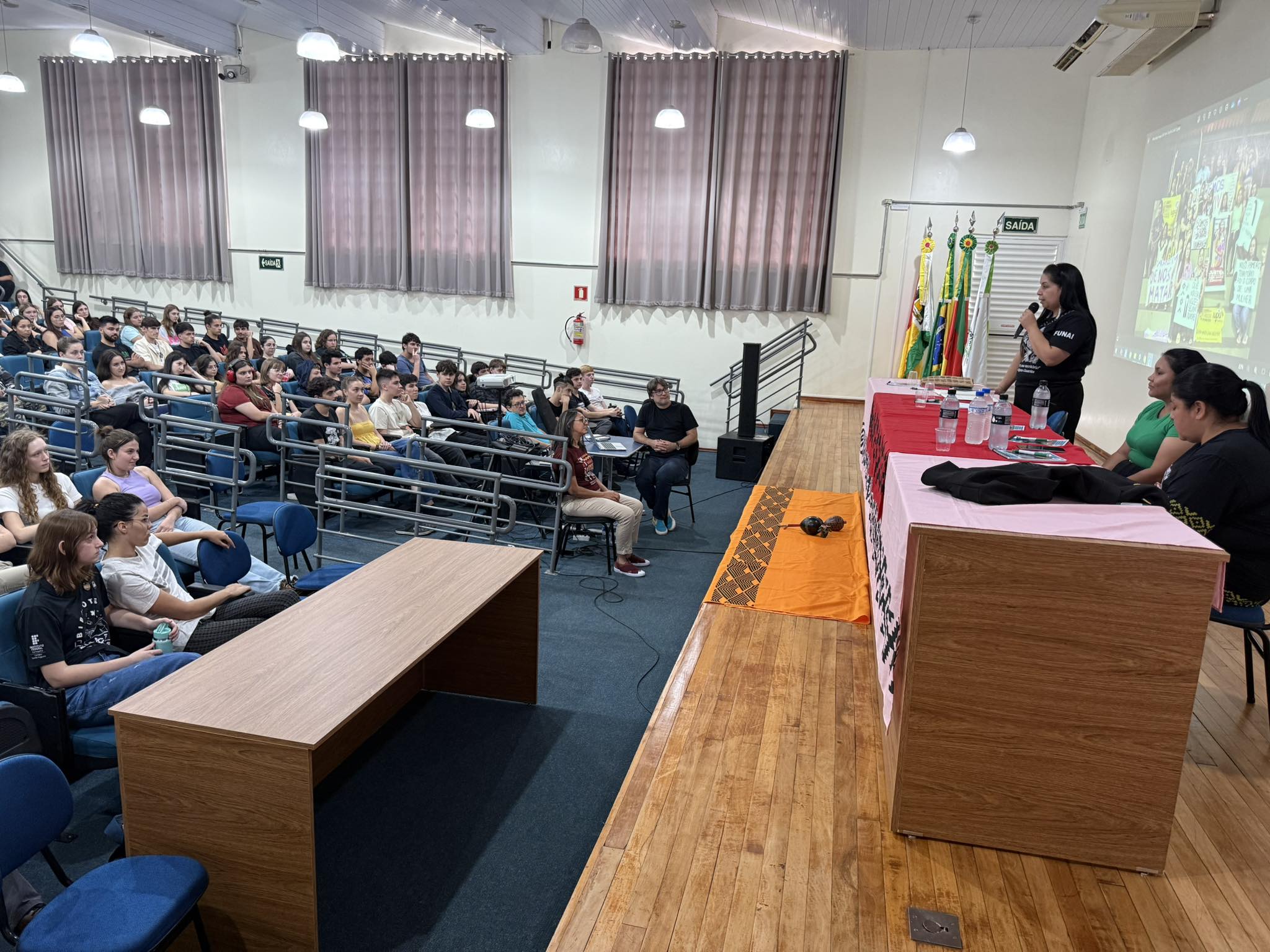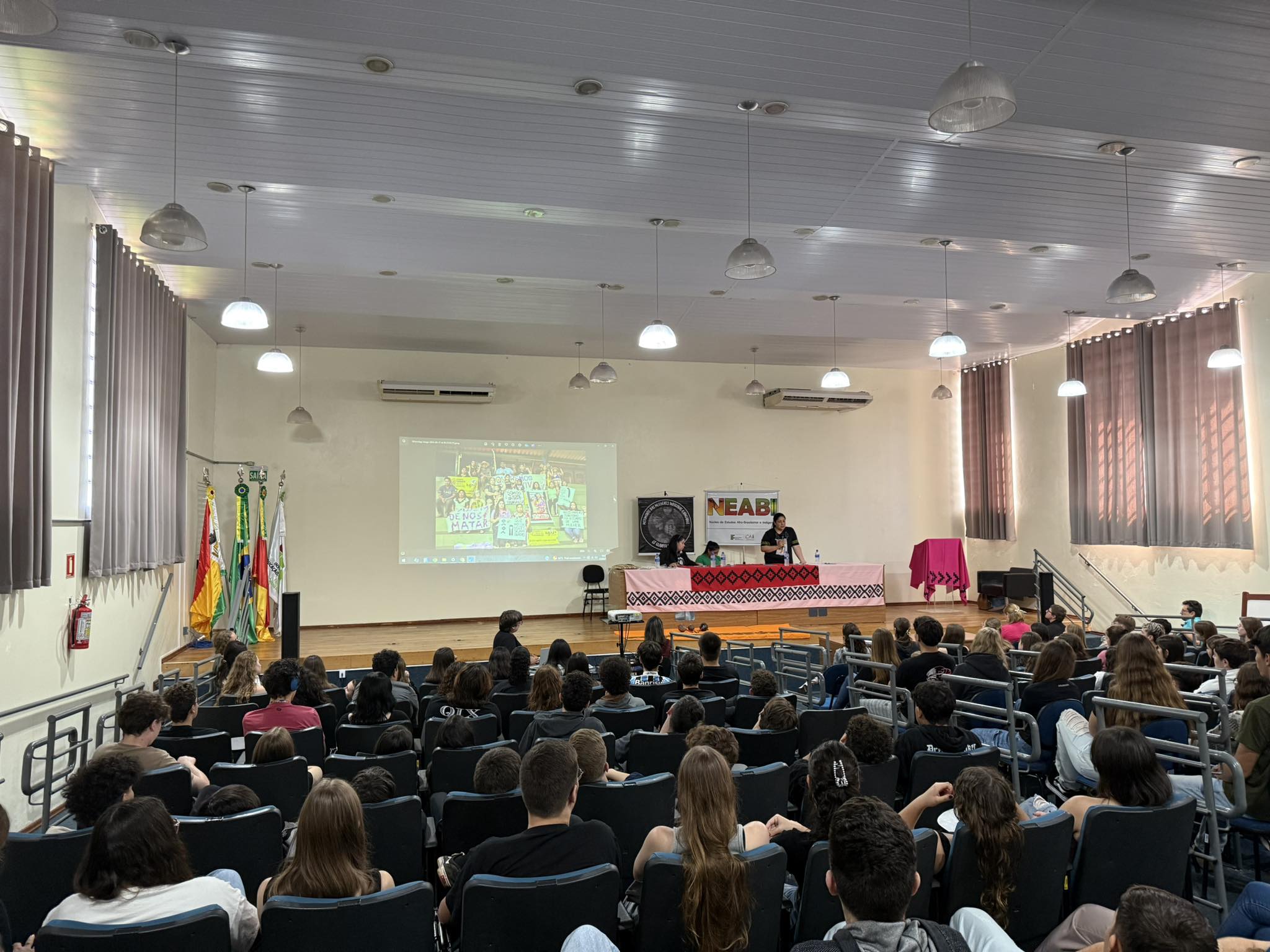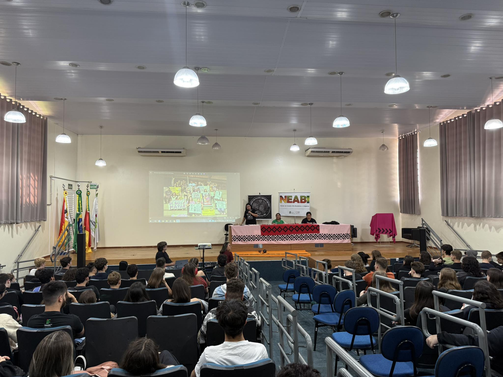 O Núcleo de Estudos Afro-brasileiros e Indígenas (Neabi) do IFFar – Campus Santo Augusto, promoveu nesta quinta-feira, 17 de abril, um evento alusivo ao Dia dos Povos Indígenas (19 de abril) e ao Dia da Terra (22 de abril), com o tema “Vozes Indígenas em defesa da cultura, do território e da vida”. As atividades, voltadas para os estudantes dos cursos técnicos integrados ao ensino médio, foram divididas em dois momentos, pela manhã, às 9h50, e à tarde, às 13h30.