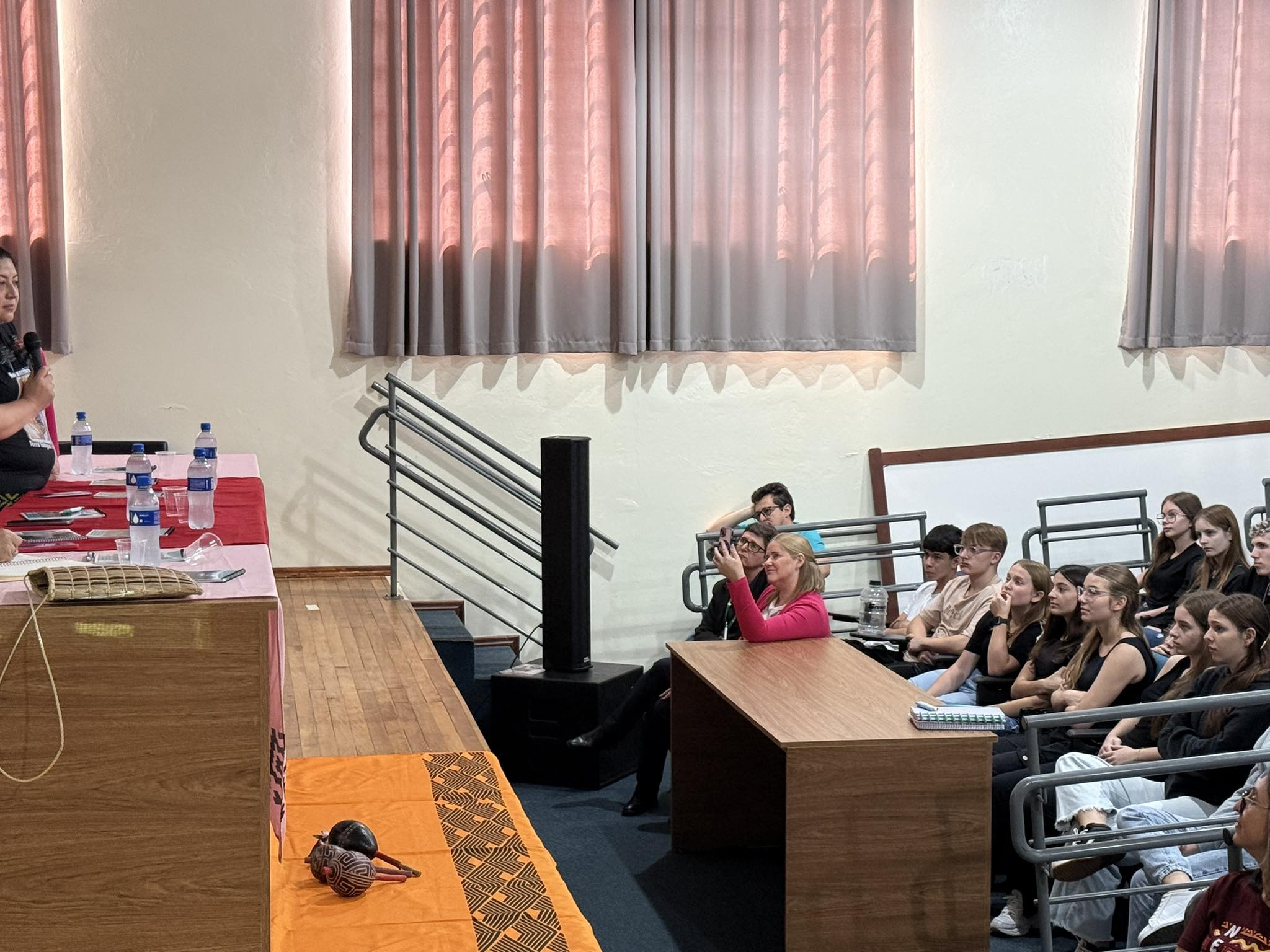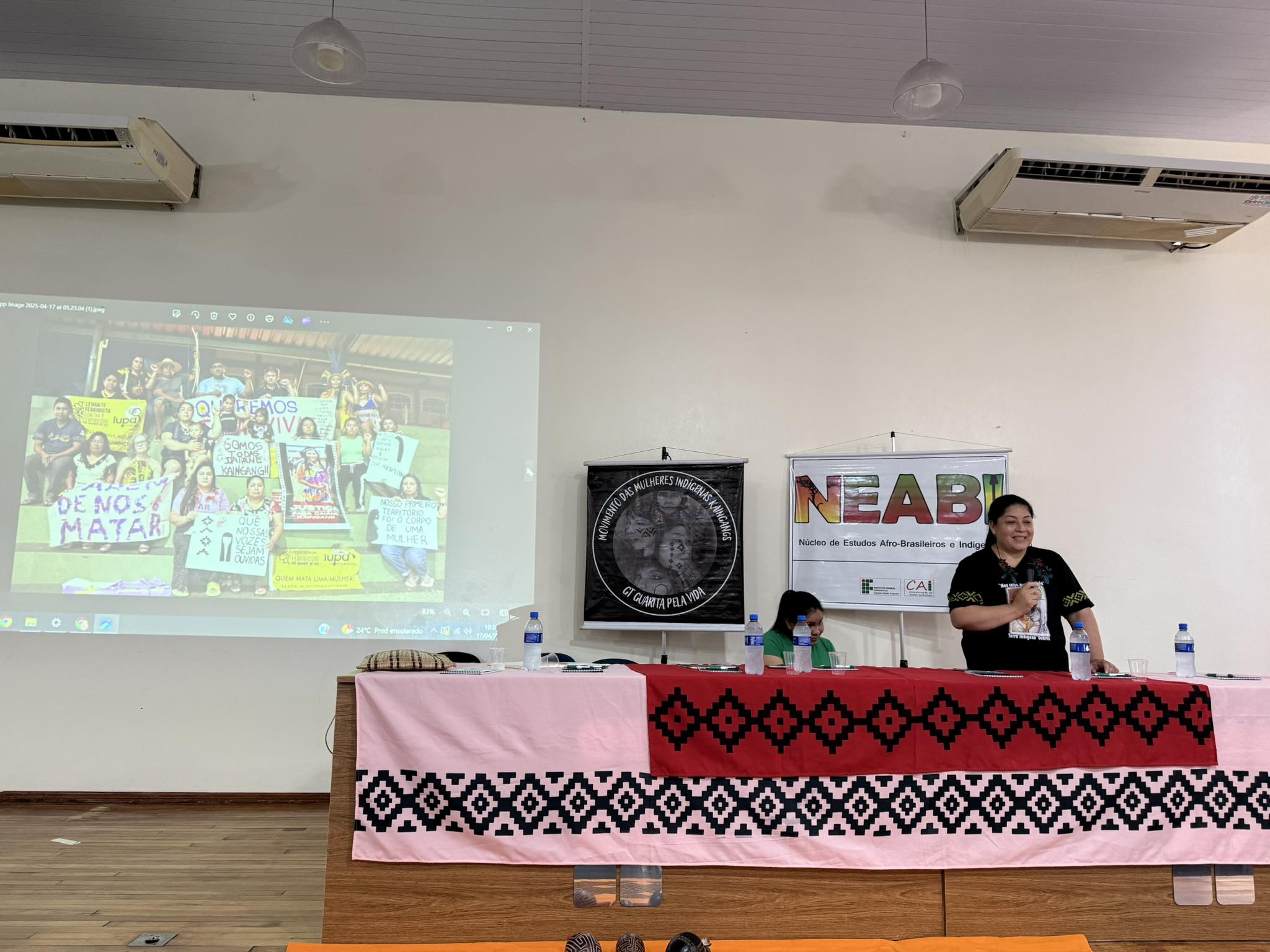 O evento contou com a participação das representantes do GT Guarita Pela Vida, professoras Beatriz Emílio e Regina Emílio e da Intérprete da Língua Kaingang, Roselaine Amaral, também da Diretora Geral do IFFar – Campus Santo Augusto, Márcia Fink, do Coordenador do Neabi, Ricardo Correa, a Diretora de Planejamento e Desenvolvimento Institucional, Janice Pinheiro Boeira, o Coordenador das Ações Afirmativas, Edevandro Sabino da Silva, e a participação especial de Cleonice Back, Assessora Parlamentar e suplente do Senador Paulo Paim do PT/RS.