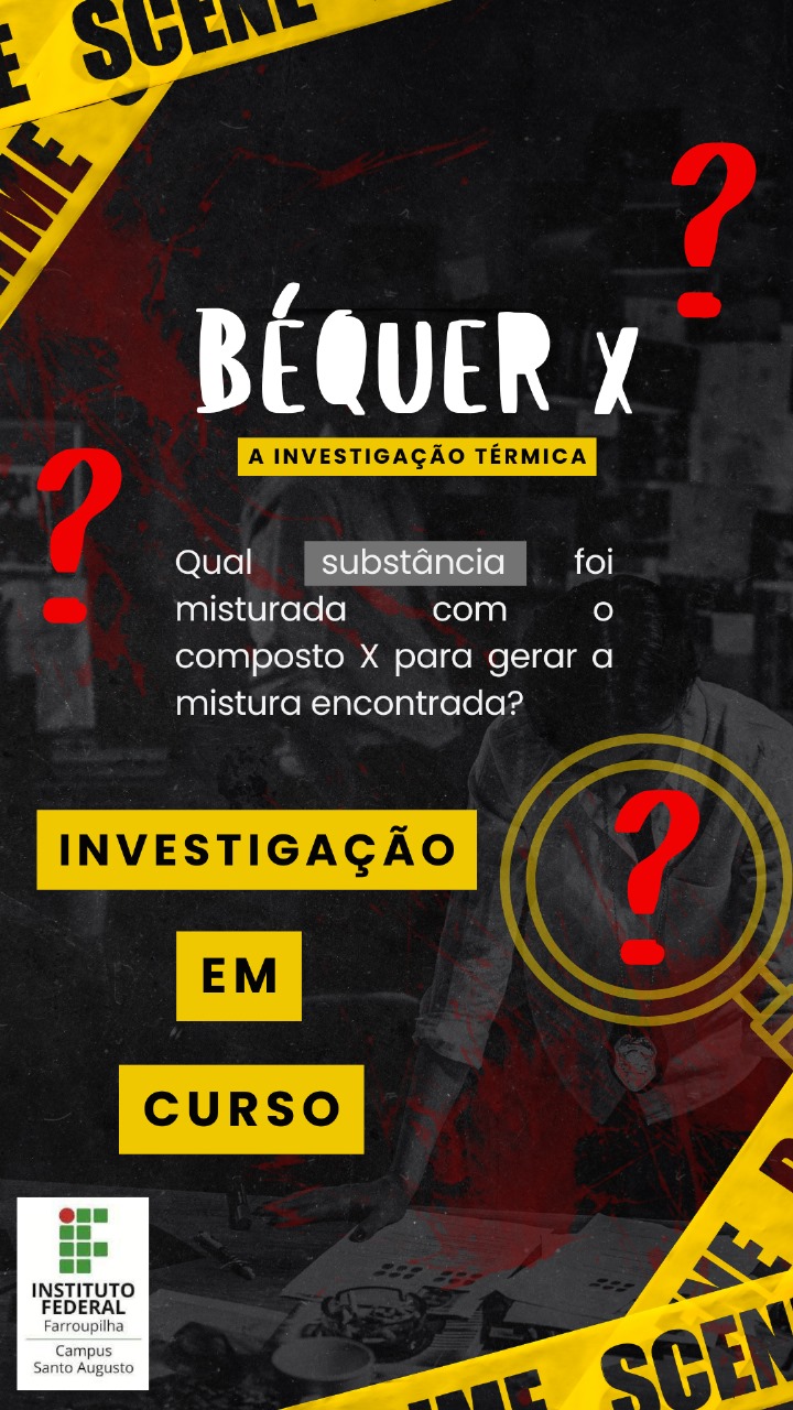 A investigação teve o seguinte enredo: Um béquer foi encontrado tombado no laboratório com uma mistura ainda morna, os estudantes precisaram descobrir qual substância participou da mistura com o composto desconhecido "X". As pistas disponíveis estão na tabela, quadro e na cena do laboratório.