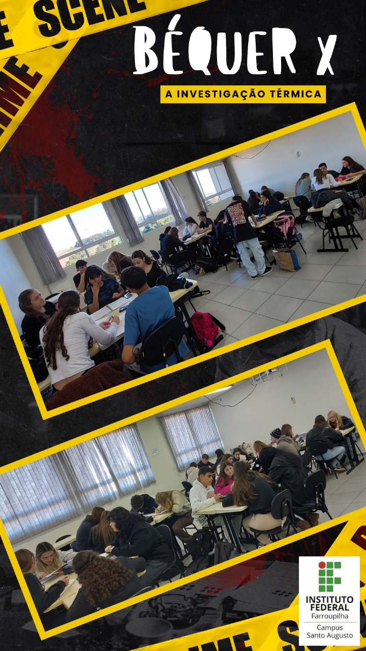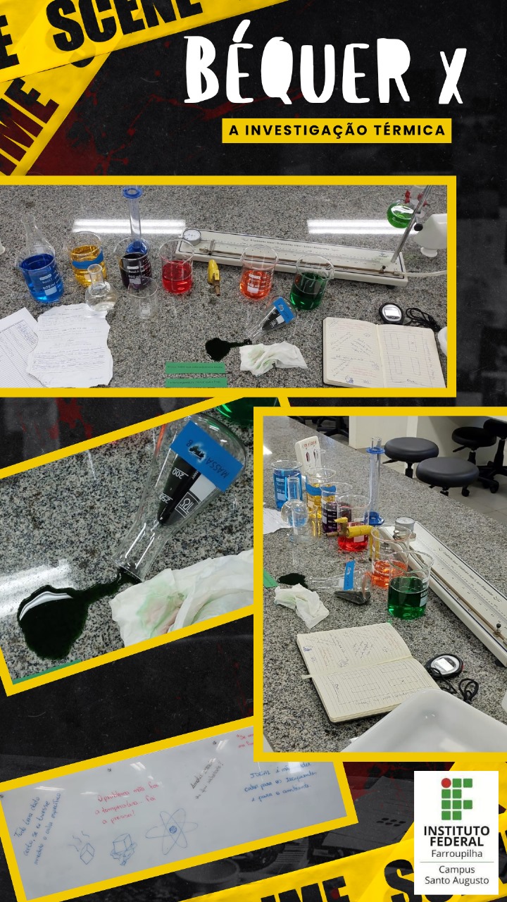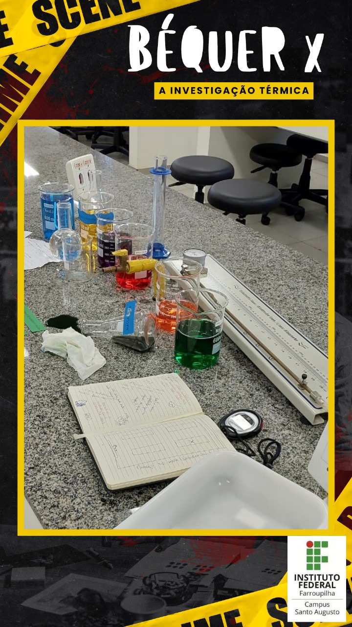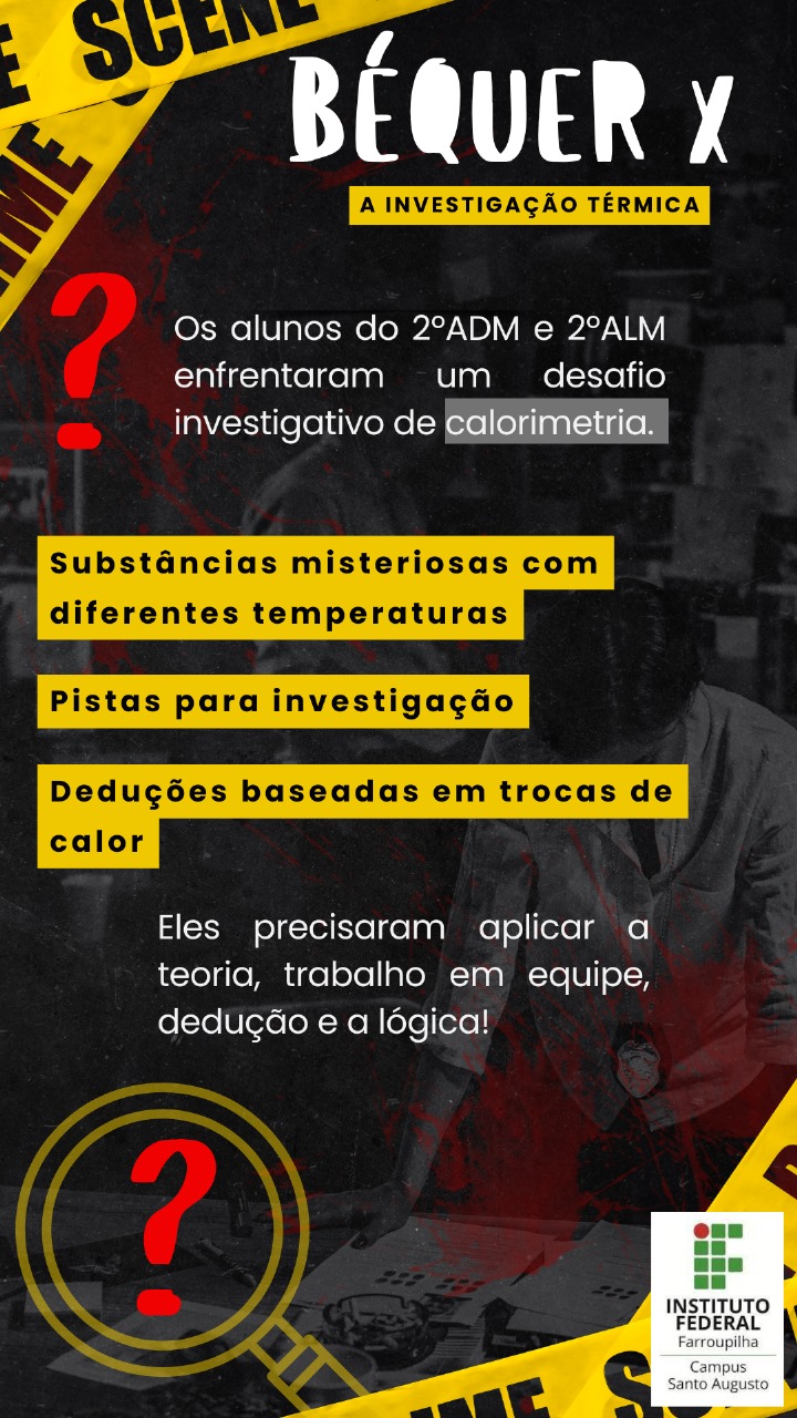 A atividade consistiu na investigação científica com abordagem de calorimetria, misturando ciência com suspense investigativo (simulação de cena de crime no laboratório), tendo como objetivo aplicar conceitos de calorimetria para resolver um caso fictício,