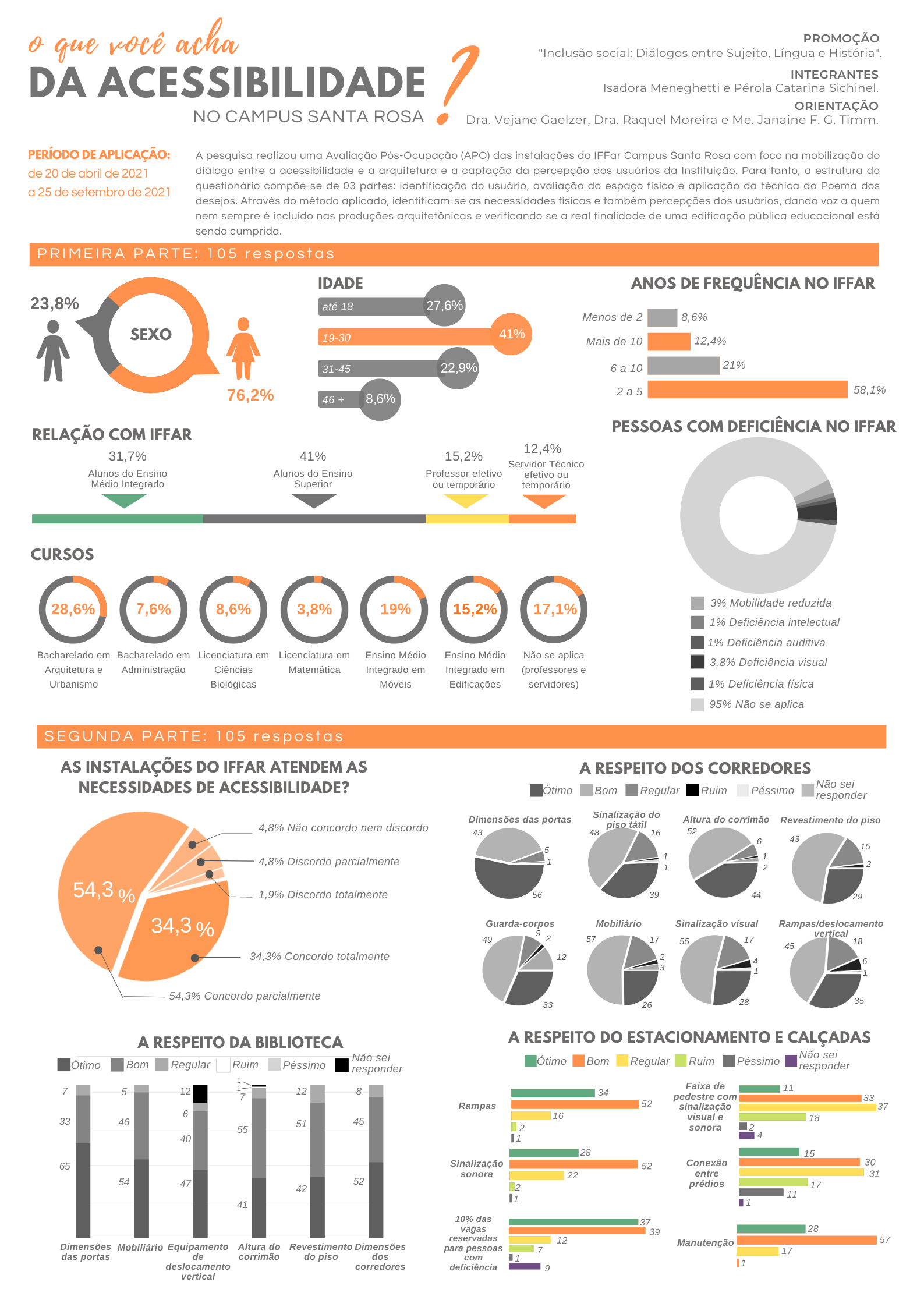 A pesquisa realizou uma Avaliação Pós-Ocupação (APO) das instalações do IFFar – Campus Santa Rosa com foco na mobilização do diálogo entre a acessibilidade e a arquitetura e a captação da percepção dos usuários da Instituição. Para tanto, a estrutura do questionário compõe-se de 03 partes: identificação do usuário, avaliação do espaço físico e aplicação da técnica do Poema dos desejos.