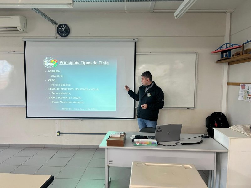 Na manhã gelada de terça-feira (01/07/25), os alunos do 3º semestre do curso de Bacharelado em Arquitetura e Urbanismo do IFFar – Campus Santa Rosa participaram de uma palestra técnica com a empresa Casa da Pintura, com o objetivo de aprofundar os conhecimentos sobre o tema "Pintura".