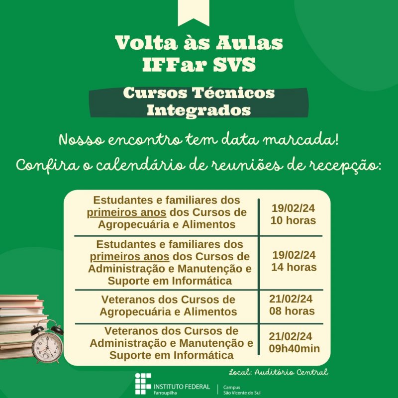 O ano letivo do IFFar inicia oficialmente na próxima segunda-feira (19), quando os estudantes retomam ou iniciam suas aulas. Em 2024, o ano letivo vai de 19 de fevereiro a 13 de dezembro, com um período de recesso no meio do ano (15 a 26 de julho).