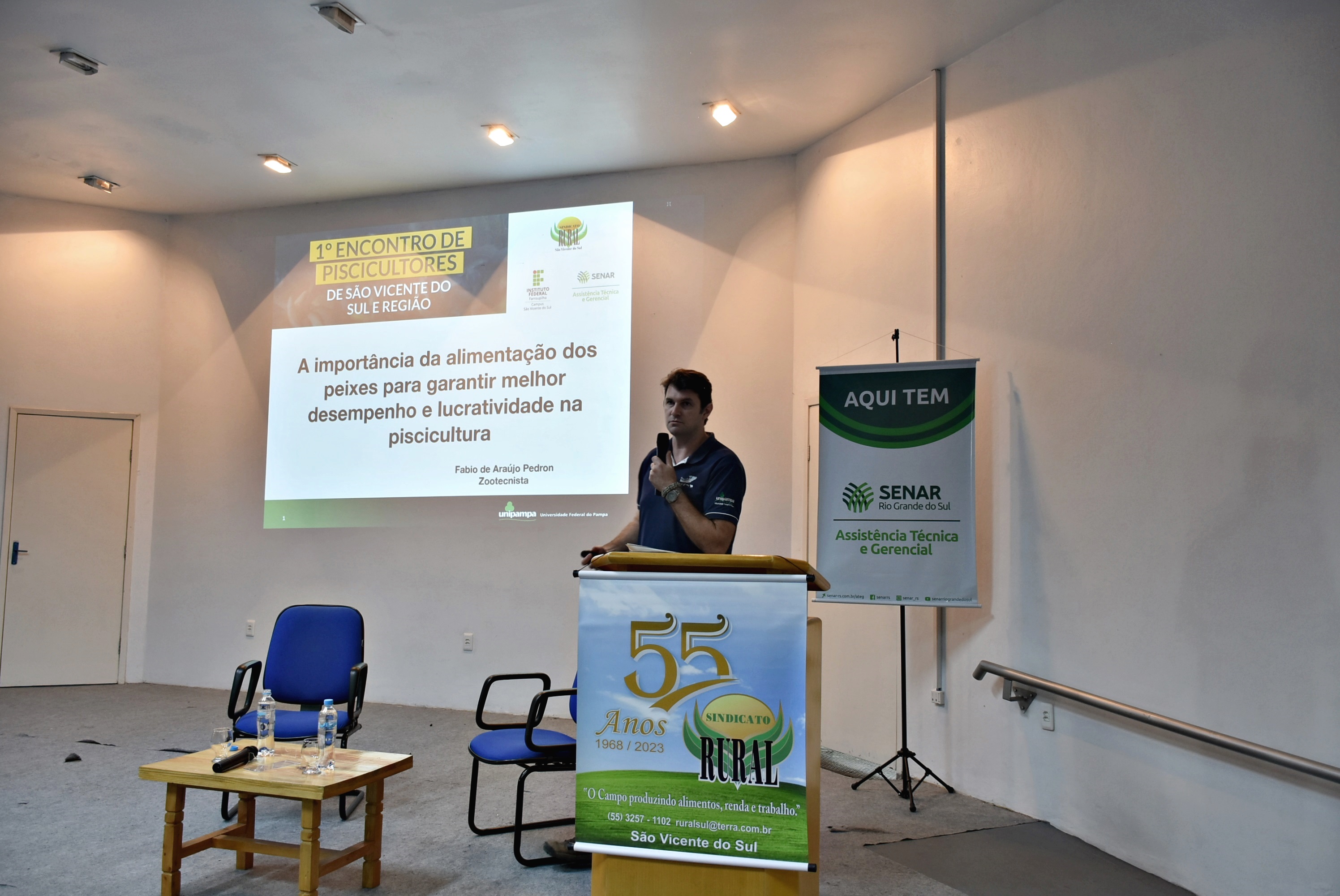 O encontro teve como objetivo promover a formação e a atualização técnica sobre o cultivo de peixes, contando com duas palestras ministradas por professores da Universidade Federal do Pampa (UNIPAMPA). As apresentações abordaram temas essenciais para o sucesso da piscicultura — a alimentação dos peixes e a qualidade da água —, fatores que impactam diretamente o crescimento, a saúde e a qualidade dos animais.
